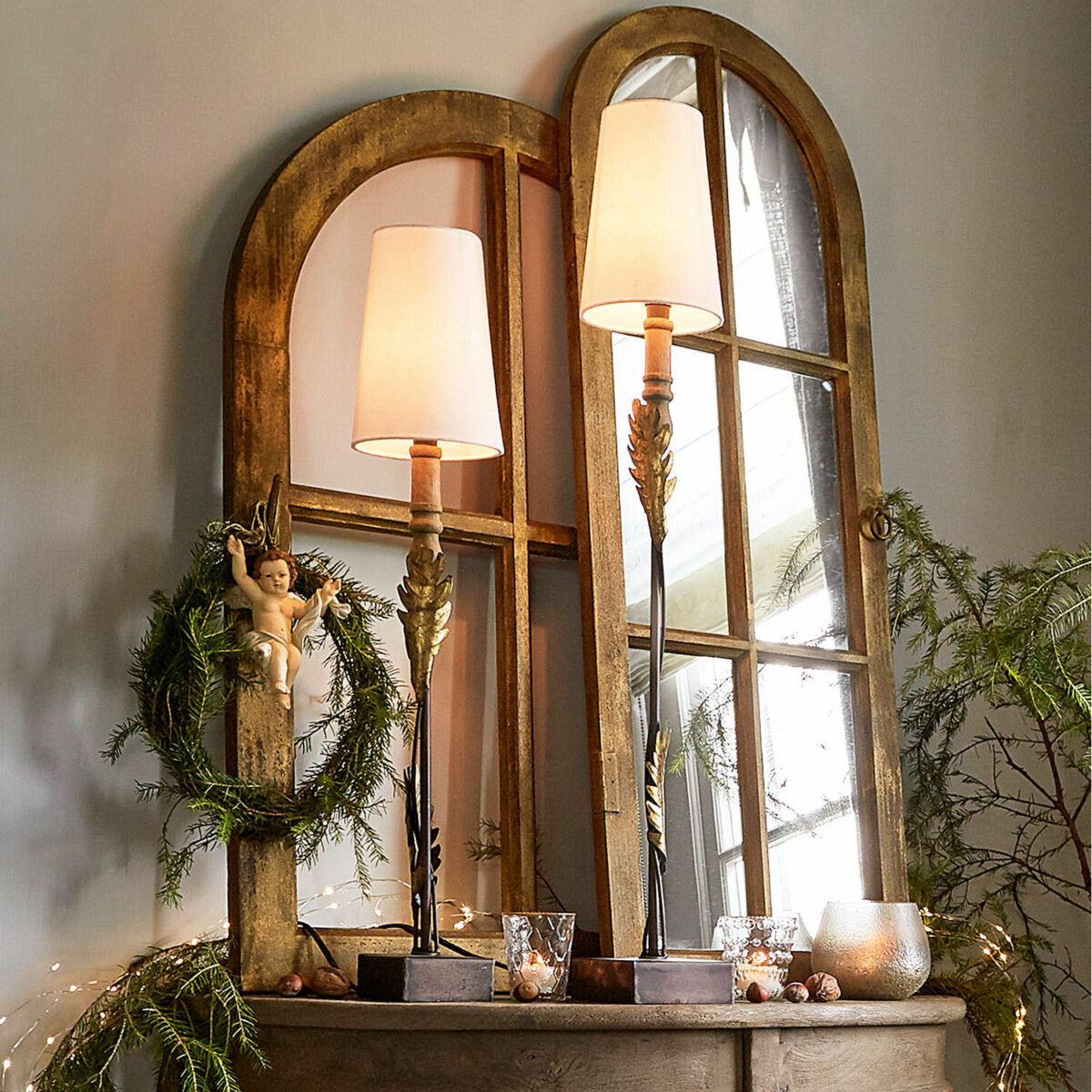 Unten kunstvoll geschmiedete Blätter aus Eisen, oben schwungvoll gedrechseltes Mangoholz – der Fuß dieser außergewöhnlichen Tischlampen vereint gleich zwei Materialwelten und erzeugt dabei ganz viel Wirkung. Das goldfarbene Antik-Finish des Metalls unterstreicht die nostalgische Anmutung. Oben thront kontrastreich ein heller runder Stoffschirm aus reiner Baumwolle. Zwei wohnliche Lieblingsstücke mit exklusivem Anspruch – stilistisch wertvoll, funktional und wunderbar vielseitig. In zwei aufeinander abgestimmten Größen sind sie überall punktuell einsetzbar und rücken das ausgesuchte Möbelstück ins schönste Licht – ob auf der Kommode, dem Klavier oder dem Beistelltisch neben dem Sofa. In Einrichtungen im Vintage-Stil fügen sie sich ideal ein, doch auch in modernem Interieur können Sie einen reizvollen Akzent setzen. Eine passende Lichtquelle ist im Lieferumfang nicht enthalten.
