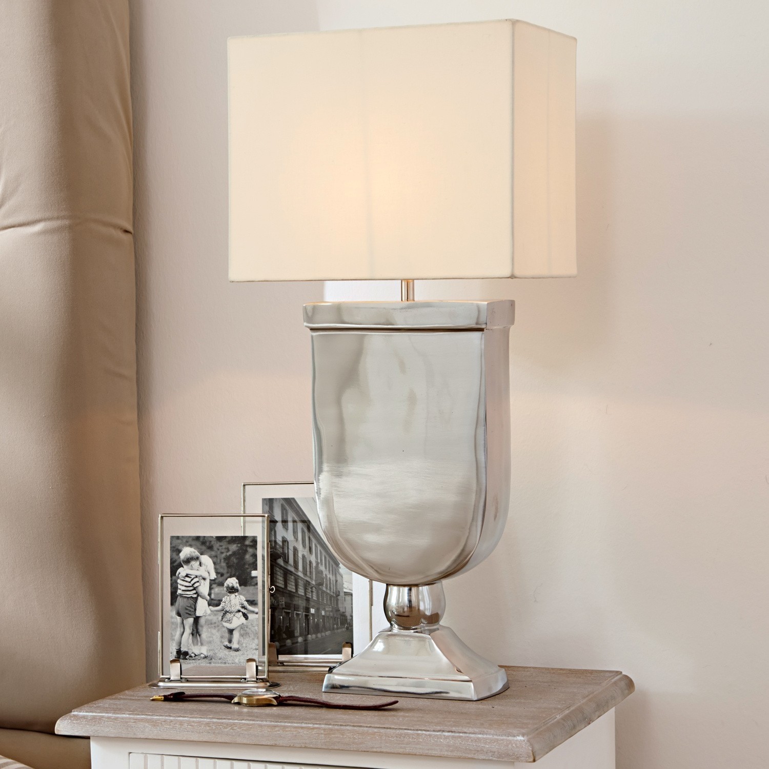 Fuß in edler Pokalform, hochglänzend aus vernickeltem Aluminumguss, dazu der geradlinige Schirm aus Baumwolle. Puristisch im Design, ausgefallen in der gradlinigen […]