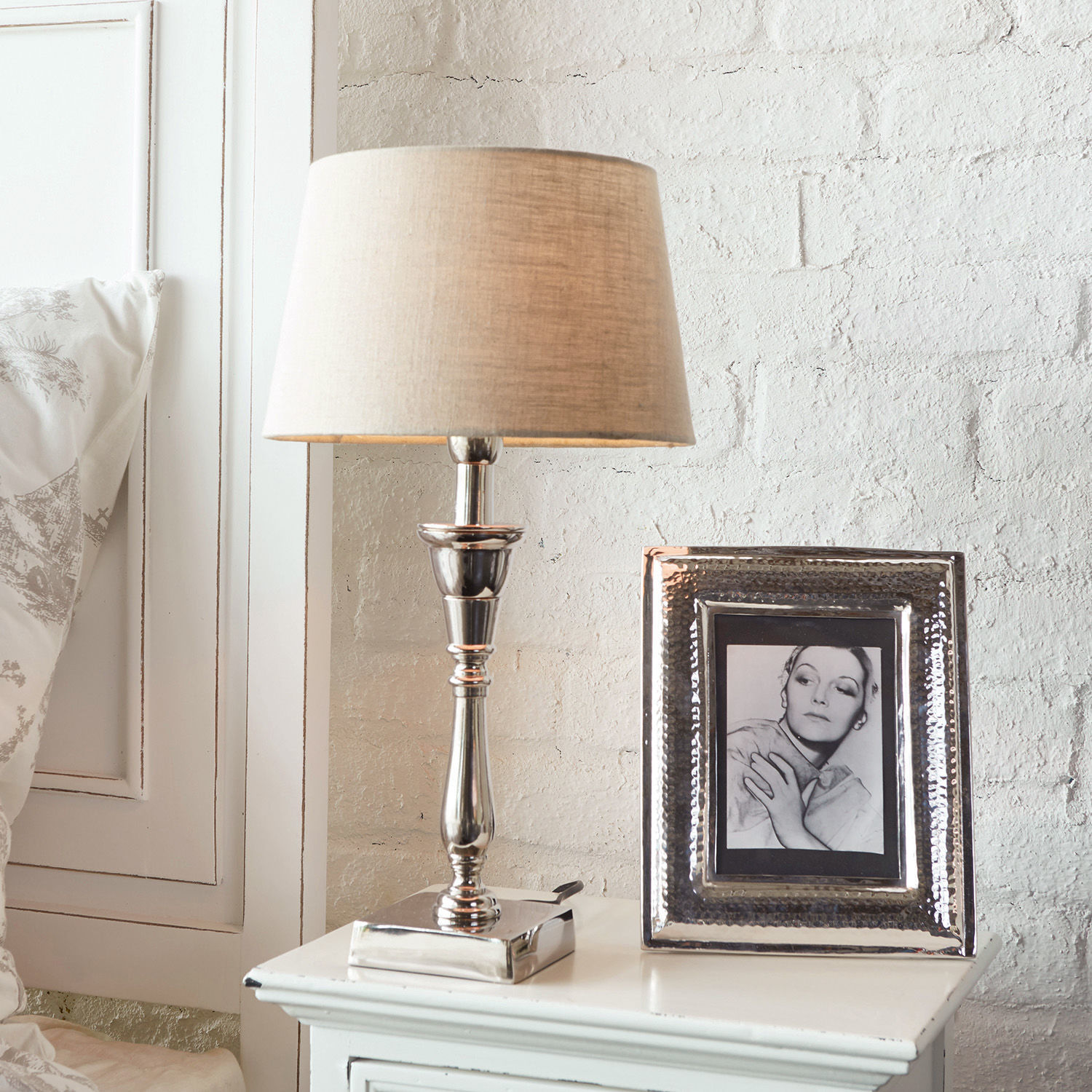 Ein absolut zeitloser Klassiker voller Eleganz und gutem Stil kommt mit dieser geschmackvollen Lampe in Ihr Zuhause. Sie bezaubert mit einem formschönen, fein glänzenden Fuß aus Aluminium. Das Schirmgestell aus Eisen sowie der Schirm aus reiner Baumwolle komplettieren den edlen Mix. Die luxuriöse Optik adelt jeden Raum – ob auf einer Anrichte, dem Arbeitstisch oder vielleicht sogar im Doppel auf je einem Nachttisch platziert, hiermit können Sie sich auf eine sehr dekorative wie auch gemütliche Lichtquelle freuen. Das ansprechende Accessoire passt hervorragend zum Landhaus-Stil und wird Ihnen viele Jahre Freude bereiten.