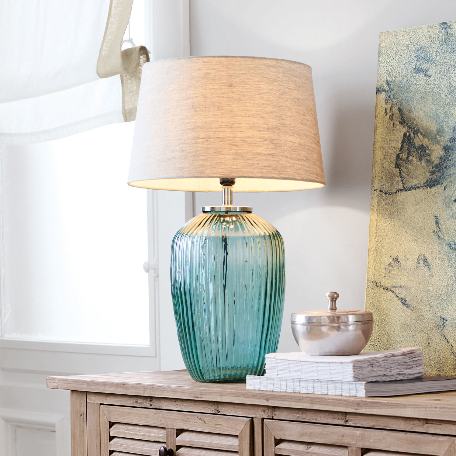Sie sind auf der Suche nach einer hochwertigen Leuchte, die nicht einfach nur Helligkeit spendet, sondern auch das Wohlfühlambiente ihres Zuhauses unterstreicht? Diesem Modell gelingt das mit Bravour, denn ihr elegantes Design und ein spannender Material-Mix heben sie deutlich von der Masse ab. Ihr zeitloser Look lässt sich in jedes Wohnkonzept integrieren, ganz gleich, ob gemütlicher Landhausstil oder neoterisches Interieur. Durch die Kombination aus edel gestaltetem Glas-Korpus und einem natürlich schönen Baumwollschirm, entsteht ein einzigartiges Wohnaccessoire. Die dezente Farbgebung des gläsernen Korpus bildet einen wunderbaren Kontrast zum erdigen Ton des Schirms. Die geriffelte Oberfläche des Glases reflektiert das Licht auf besonders attraktive Art und Weise. Luxuriös schimmernde Eisenelemente runden das stilvolle Design gekonnt ab. Der Schirm gibt nach oben und unten großzügig Licht ab und das macht diese Tischleuchte zu einer besonders stimmungsvollen Zusatzbeleuchtung. Durch ihre Größe macht sie sich perfekt auf einen Beistelltisch im Wohnzimmer, auf der Kommode im Salon oder als lichtspendender Blickfang im Wintergarten.