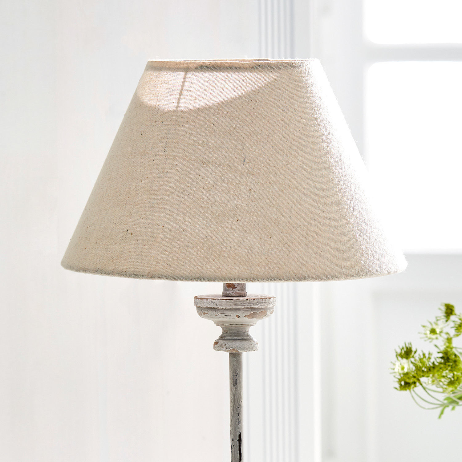 Es ist der charmante Kontrast zwischen dem kunstvoll gedrechselten Holzsockel und dem feinen Gewebe des Lampenschirms, der diese Tischleuchte so besonders macht. Das aufwendig applizierte Shabby-Finish glänzt mit handgearbeiteten Details und charmantem Farbspiel. Der robust gewebte Schirm ist perfekt darauf abgestimmt und blickdicht, aber natürlich leicht lichtdurchlässig. Die Silhouette des gedrehten Sockels korrespondiert einfach schön mit dem konischen Schirm. Kurz: Mit diesem eleganten Lichtspender beleuchten Sie jeden Raum mit klassischer Raffinesse.