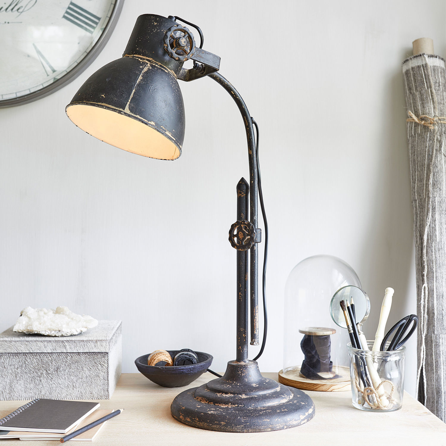 Diese Tischleuchte zeichnet sich durch ihre Funktionalität und den beeindruckenden Details im Industrial-Style aus. Das höhenverstellbare Gestell folgt einem leichten Bogen, der in den klassisch geformten Schirm übergeht. Die kreisrunde, fein abgestufte Basis vollendet den geschmackvollen Look und sorgt für Standfestigkeit. Die Drehrädchen zum Verstellen von Höhe und Schirmausrichtung erinnern an viel benutze Ventile in einer stilgelegten Fabrik. Ein tolles Detail für eine authentische Industrie-Ästhetik. Das aufwendig applizierte Antik-Finish ist in mehreren Schichten aufgetragen und verdeutlicht den industriellen Charme dieser besonderen Tischlampe.