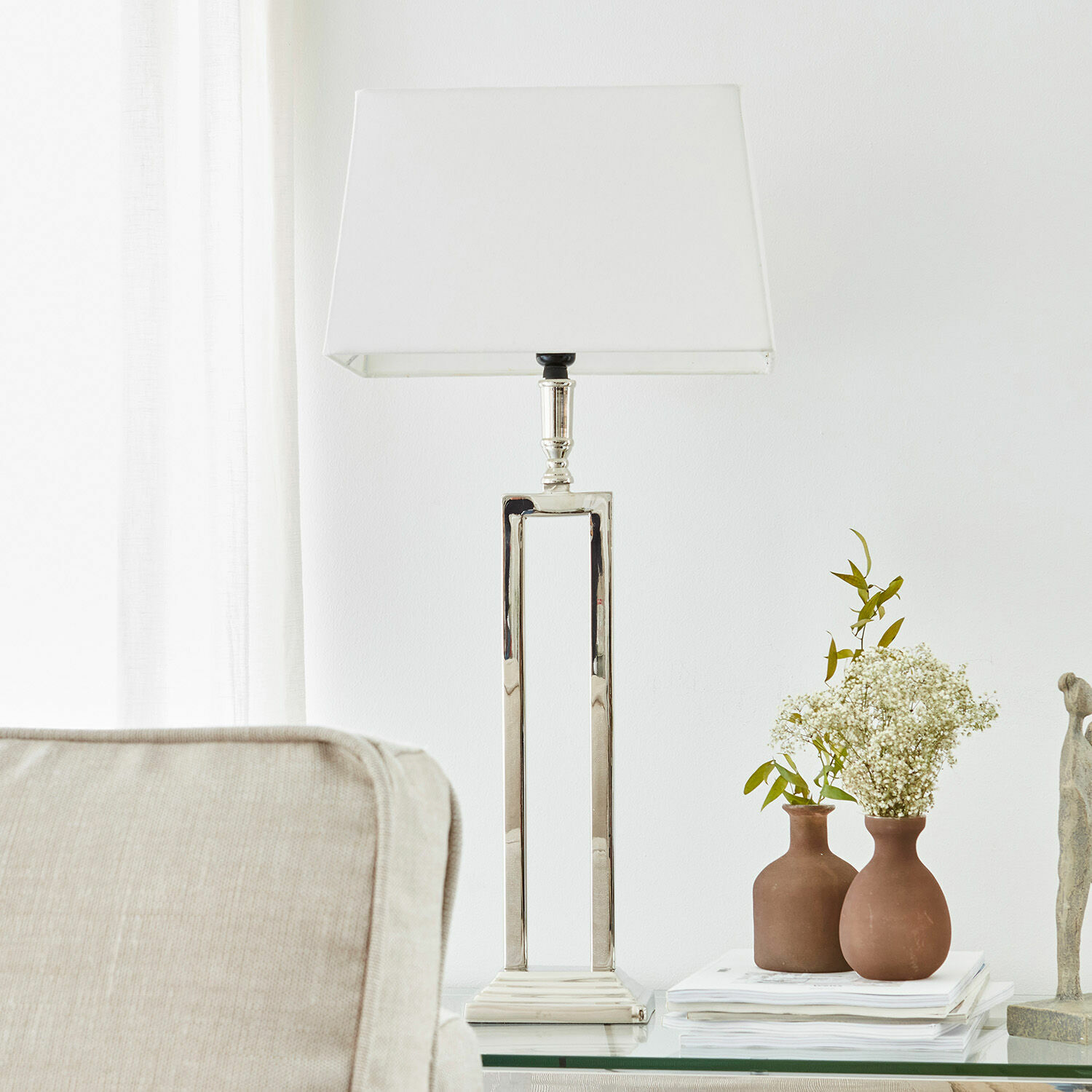 Zeitlos schön und mit dem gewissen Etwas – diese Merkmale zeichnen Design-Klassiker aus, die auch Generationen später noch begeistern und als exklusive Stücke gerne in neue Wohnmilieus integriert werden. Eine solche Erfolgsgeschichte könnte auch dieser Tischlampe beschieden sein, denn der eigene Charakter dieser Kreation bleibt auch dem flüchtigen Betrachter nicht verborgen. Das Gestell ist klassisch designt mit einem stilvollen, hochglänzenden Metallgestell. Auch der Lampenschirm ist schnörkellos gestaltet, erhält aber durch die rechteckige Form die individuelle Note. Und bringt mit der Naturfaser Baumwolle die wohnlich-warme Note ins Spiel. So gekonnt der Designer bei dieser Tischlampe die Gegenpole Metall und Naturfaser, kühl und warm verbunden hat, so selbstbewusst wird sich die Tischlampe in die verschiedensten Wohnstile einfügen. Ganz gleich, ob bei Ihnen verspieltes Landhaus-Flair den Ton angibt oder ob die rustikale Ausprägung die Oberhand hat, selbst in Wohnmilieus mit Industrial-Atmosphäre wird die Tischlampe ein exklusives Accessoire sein. Vor allem, wenn am Abend der Lichtschein durch die obere und untere Öffnung des Lampenschirms fällt und anheimelnde Licht-Akzente im Raum setzt.