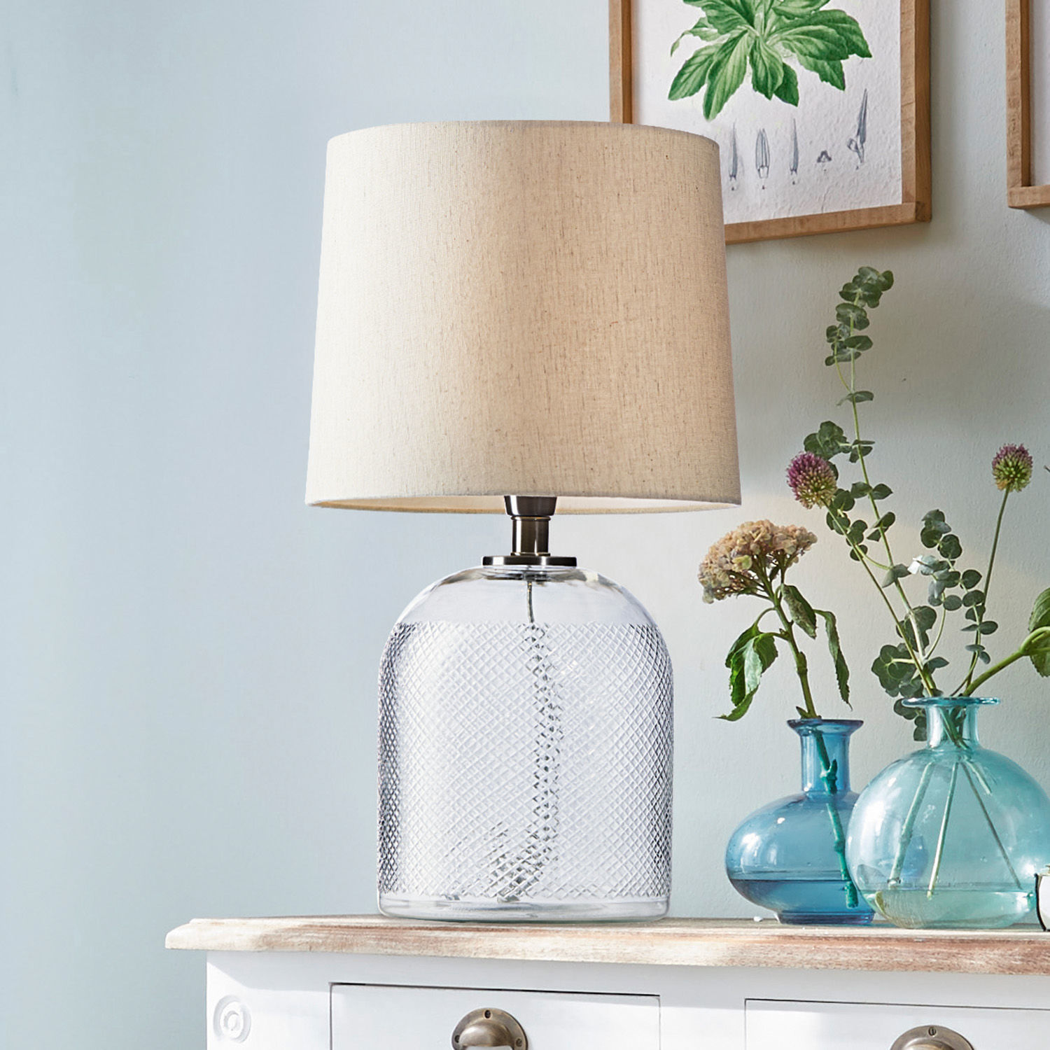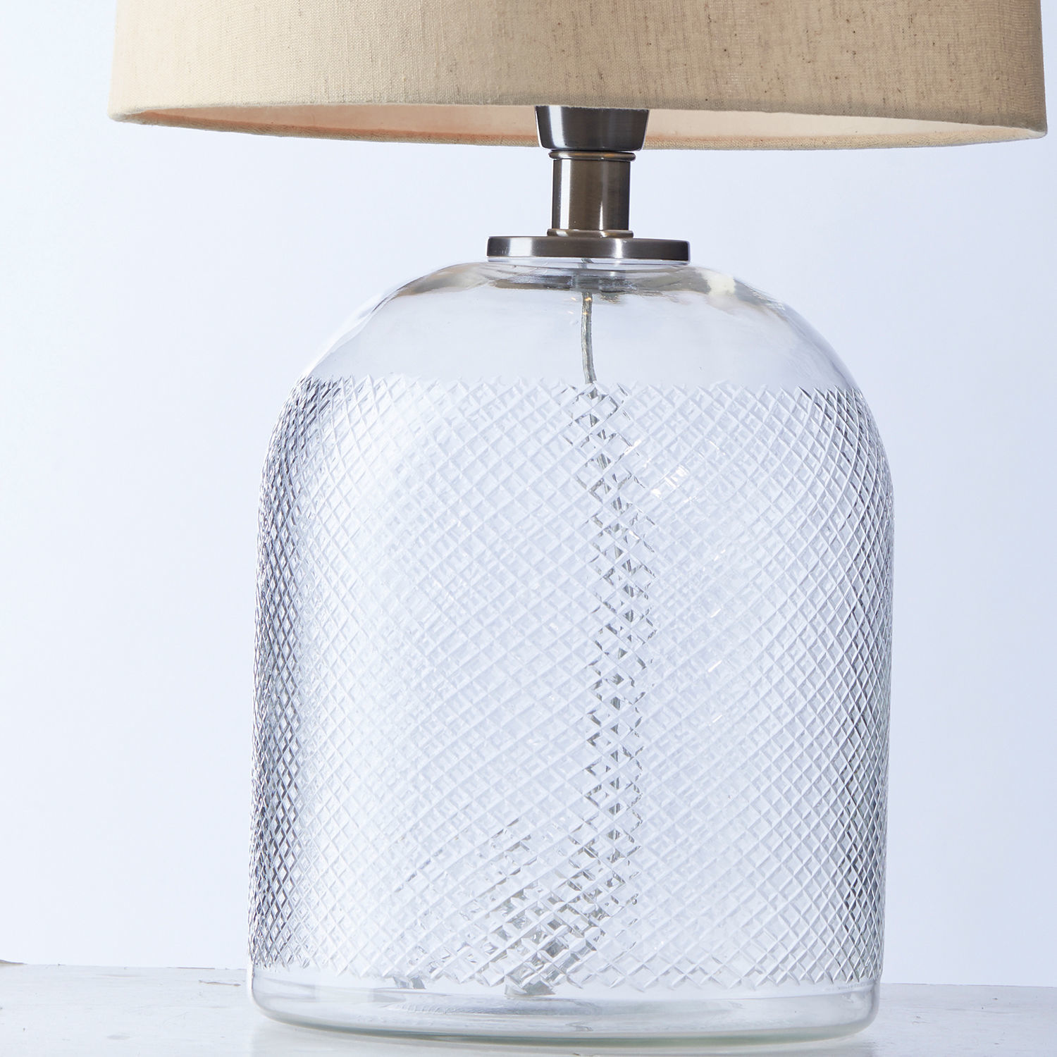 Ein besonders stilvoller Lichtspender, perfekt geeignet für die Kommode im Salon oder den Couchtisch im Wohnzimmer. Der transparente Leuchtenfuß besteht aus sehr hochwertigem Klarglas. Der feine Kreuzschliff zeugt dabei von einer besonderen Liebe fürs Detail. Bereits im ausgeschalteten Zustand ist die Lampe eine Augenweide, doch beleuchtet entfaltet die strukturierte Oberfläche des Glases seine volle Wirkung. Es ist so als würden die Lichtstrahlen über das Muster tanzen und glitzernde Spuren hinterlassen. Der klassische Lampenschirm bildet einen charmanten Kontrast dazu. Er ist aus Baumwolle gewebt und punktet mit einer unverfälschten, natürlichen Anmutung. Abgerundet wird das Ganze durch einen polierten Eisenkragen, der Schirm und Korpus standfest verbindet.