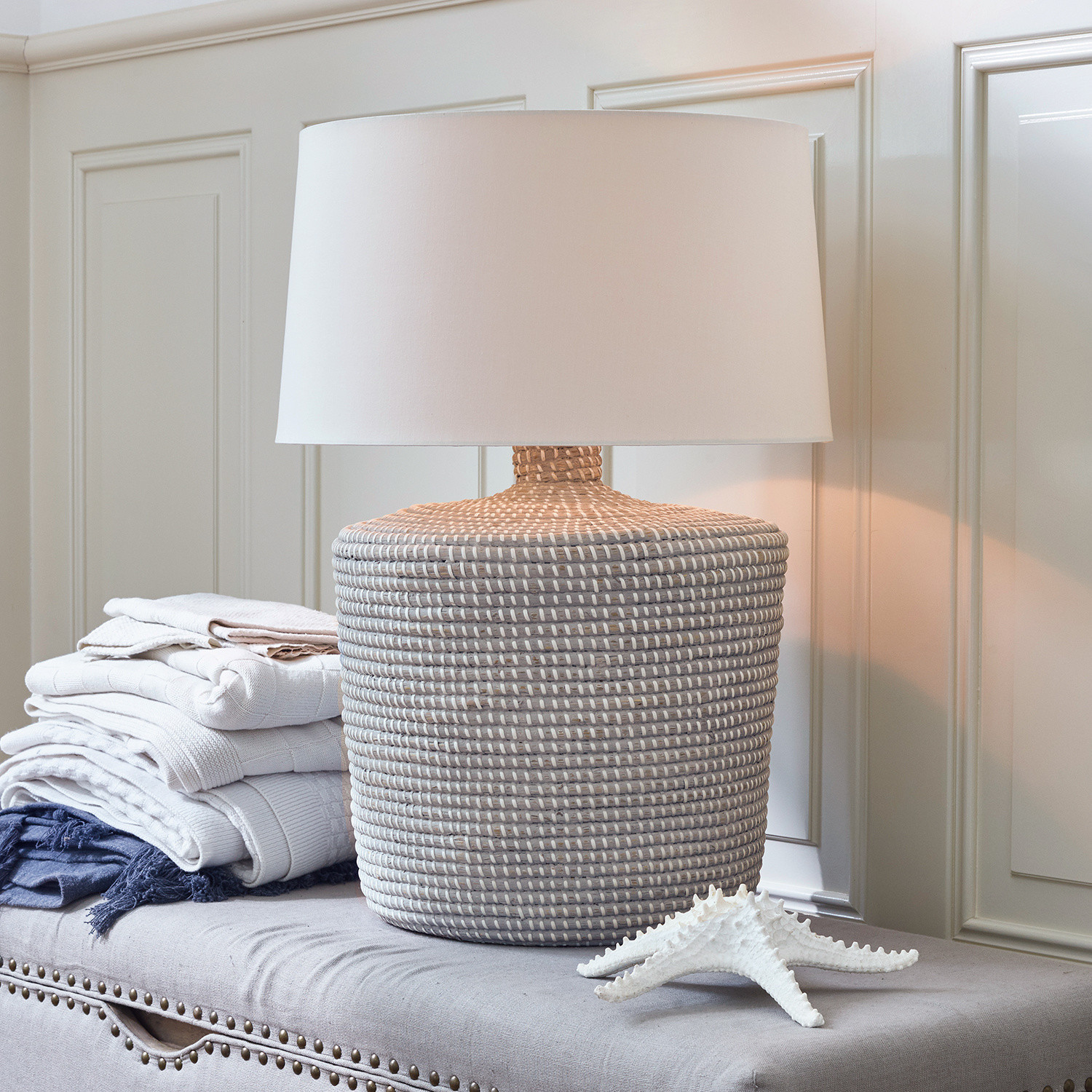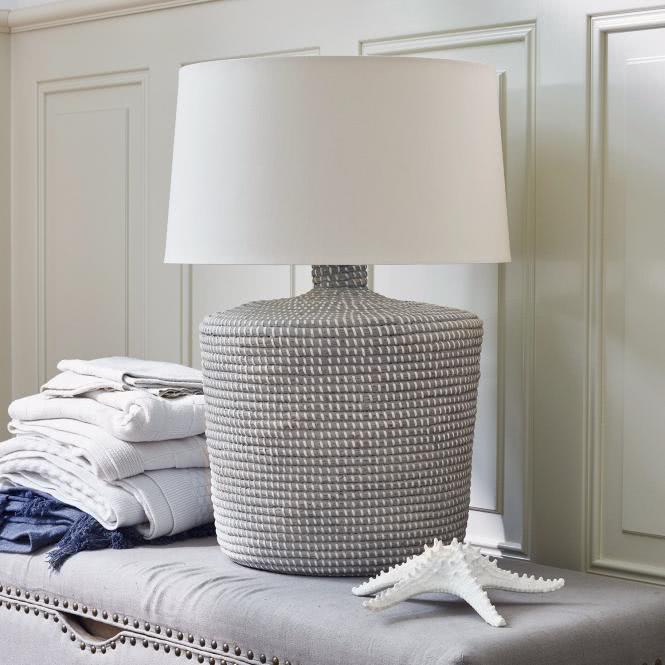 Wunderschöner Sockel aus geflochtenem Seegras. Klassischer Lampenschirm aus hochwertiger Baumwolle. Dank der imposanten Höhe auch in großen Räumen ein Blickfang. […]