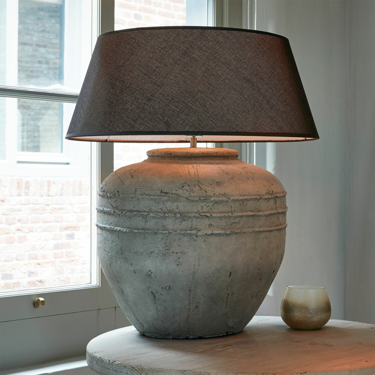 Zeitlos schön und modern zugleich: Diese außergewöhnliche Tischlampe in antiker Optik zieht Blicke auf sich, indem sie klassischen Look und modernes Flair spielerisch vereint. Der Lampenfuß wurde mit Detailliebe von Hand in einer Schablone geformt und besteht aus hochwertiger Keramik, die sich im angesagten Beton-Design zeigt. Im oberen Bereich verzückt der Lampenfuß mit einer dreireihigen, umrundenden Verzierung und erinnert zusammen mit der edlen antiken Farbgebung und seiner vasenartigen Form an ein historisches Gefäß der Römerzeit. Dass die Lampe innen hohl ist, überrascht und macht sie leichter, als ihr massives Aussehen zunächst nicht vermuten lässt. Der Lampenschirm bezaubert durch sein klassisches Design und wurde aus Leinen gefertigt. Stellen Sie dieses außergewöhnliche Schmuckstück auf einen Tisch oder auf eine Kommode in Ihrem Zuhause – es wird sich elegant in Ihren Einrichtungsstil fügen und ein schönes, gedämpftes Licht zaubern. Bei der Wahl des Leuchtmittels sind Sie frei und können so selbst bestimmen, wie Ihre Lampe leuchten soll.