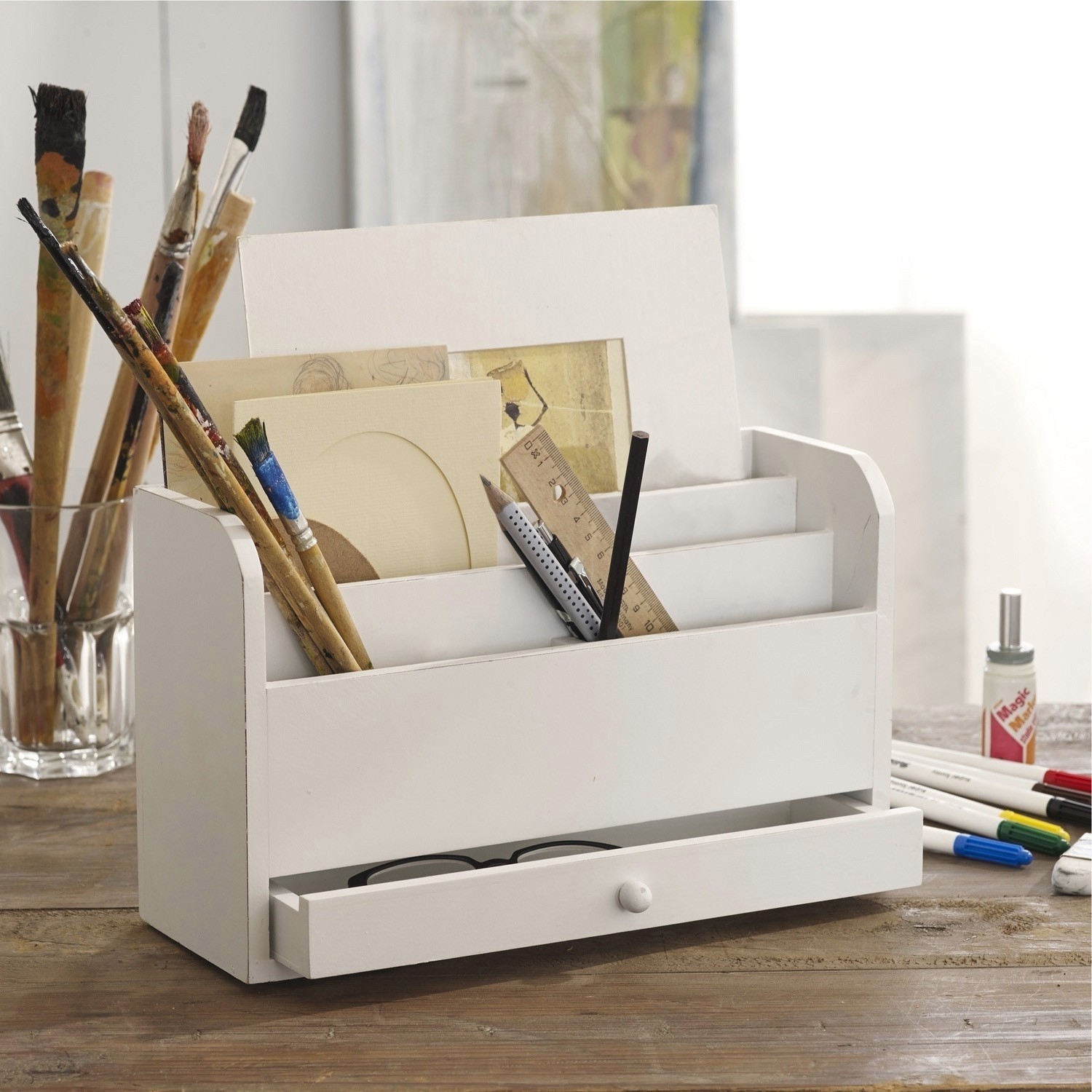 Ordnungshelfer im Antik-Look: Dieser hölzerne Tischsekretär punktet mit vielen Fächern und einer kleinen Schublade zum Verstauen von Notizzetteln, Briefen, Stiften und Briefmarken. Ein praktisches Accessoire mit Charme – versehen mit einem Finish in Antikweiß. Toll auf dem Schreibtisch, in der Küche oder im Flur und passend zu praktisch jedem Einrichtungsstil.