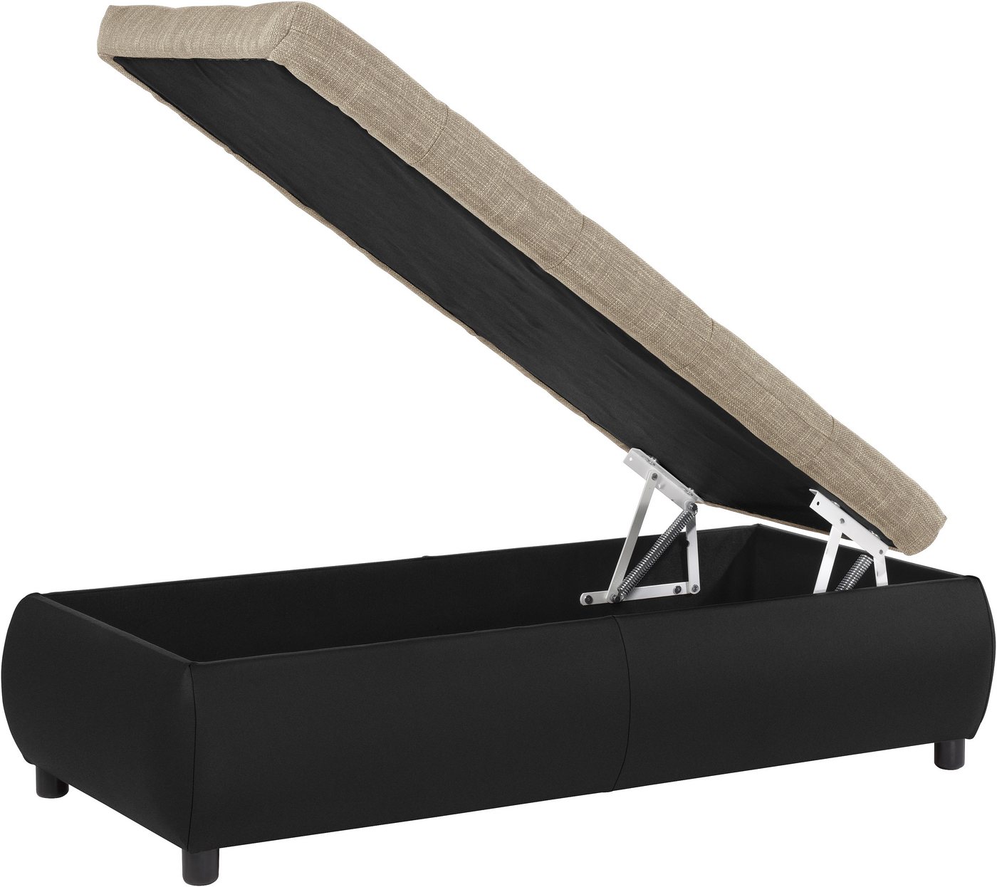 Dieser schicke Hocker kann wahlweise mit Stauraum-Fach bestellt werden. Dann bietet er außer der Sitzgelegenheit für zwei Personen auch noch reichlich Platz für Utensilien, die man gerne mal vor den Blicken verschwinden lässt. Eine hübsche Variante, im Wohnzimmer Ordnung zu halten. Seinen Nutzfaktor verbindet er mit wohnräumlichem Design. Zwischen Sitzkissen, Korpusbezug und den Kunststofffüßen herrscht ein angenehmer Kontrast. Der Fußhocker ordnet sich der vorhandenen Einrichtung unter und untermalt das gewünschte Ambiente gekonnt. Dadurch ist er funktionales Sitzmöbel und dekorativer Einrichtungsgegenstand im Wohnzimmer zugleich. Der wahlweise mit Stauraum-Fach bestellbare Hocker kommt mit Wellenunterfederung, Polyätherschaum-Polsterung und solidem, stabilem Holzuntergestell.