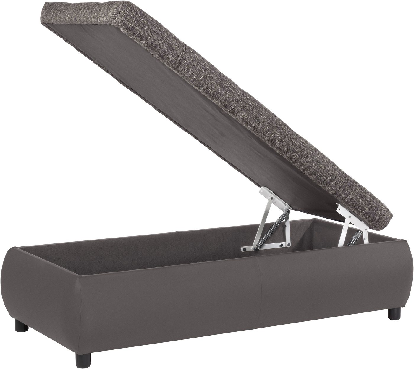 Dieser schicke Hocker kann wahlweise mit Stauraum-Fach bestellt werden. Dann bietet er außer der Sitzgelegenheit für zwei Personen auch noch reichlich Platz für Utensilien, die man gerne mal vor den Blicken verschwinden lässt. Eine hübsche Variante, im Wohnzimmer Ordnung zu halten. Seinen Nutzfaktor verbindet er mit wohnräumlichem Design. Zwischen Sitzkissen, Korpusbezug und den Kunststofffüßen herrscht ein angenehmer Kontrast. Der Fußhocker ordnet sich der vorhandenen Einrichtung unter und untermalt das gewünschte Ambiente gekonnt. Dadurch ist er funktionales Sitzmöbel und dekorativer Einrichtungsgegenstand im Wohnzimmer zugleich. Der wahlweise mit Stauraum-Fach bestellbare Hocker kommt mit Wellenunterfederung, Polyätherschaum-Polsterung und solidem, stabilem Holzuntergestell.
