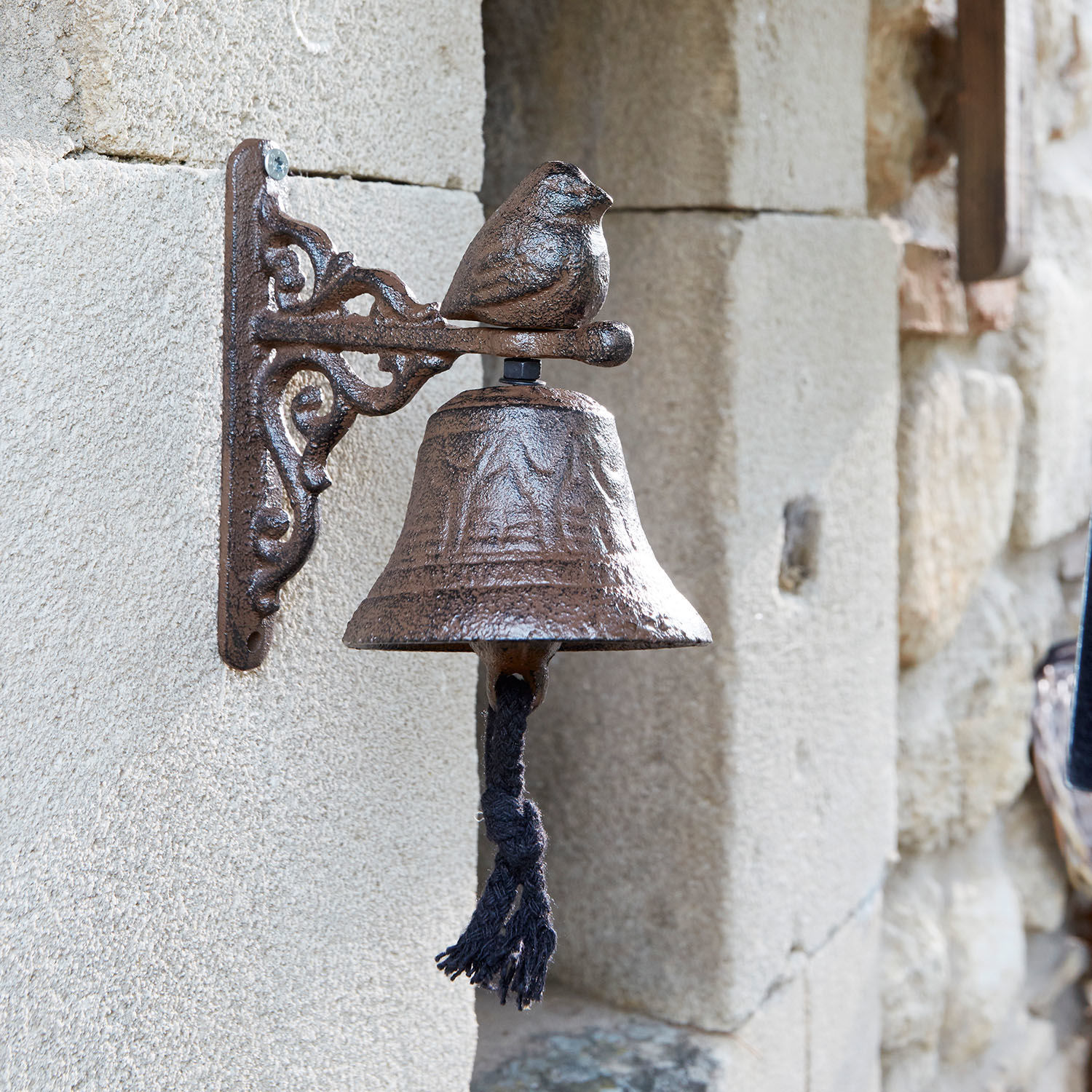 Ein Design voller Charme und Nostalgie – diese schöne Türglocke aus schwerem Gusseisen erinnert an frühere Zeiten. Sie ist kunstvoll verziert und mit einem reizenden Vögelchen geschmückt. Das hübsche Stück ist ebenso nützlich wie dekorativ – hiermit können sich Besucher wie in der guten, alten Zeit anmelden. Am Hauseingang oder vielleicht an einem Gartenhäuschen angebracht ist das ein schönes Detail. Wer möchte, kann die süße Glocke auch einfach als Wandschmuck nutzen, vielleicht für Balkon oder Terrasse. Natürlich macht sie sich auch innen gut. Befestigen Sie die detailreich designte Glocke einfach an der Wand, schon können Sie sich an diesem Anblick erfreuen. Träumen Sie sich mit solch feinen Deko-Details in eine ländliche Idylle, vielleicht in ein kleines Cottage mit blühendem Garten. Vintage-Charme für Romantiker – ein sehr liebevolles Design für alle, die ihr Heim noch gemütlicher machen wollen.