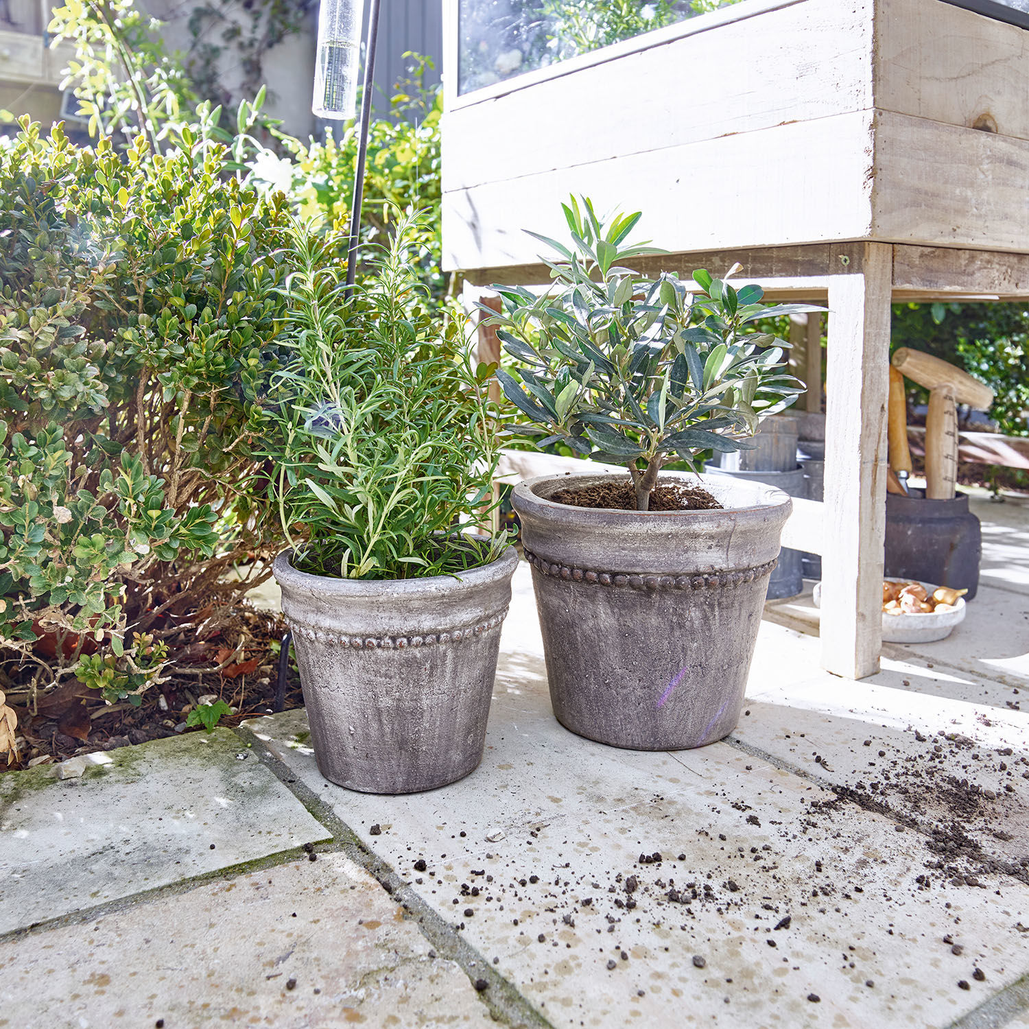 Hiermit kommt ein dezentes und elegantes Doppel aus Terrakotta in interessanter Beton-Optik zu Ihnen. Es ist mit einer feinen Verzierung geschmückt und bringt ein wenig Toskana-Feeling mit. Im Set erhalten Sie zwei Größen. Das Design ist langlebig und ganz klassisch, sodass Sie sich viele Jahre daran freuen können. Geben Sie hiermit duftenden Blumen, kleinen Bäumchen, Gräsern oder Kräutern einen hübschen Platz. Ob in Innenräumen oder für Terrasse und Balkon, mit diesem stilsicheren Doppel treffen Sie immer eine gute Wahl und holen sich die Natur in Ihr Heim.