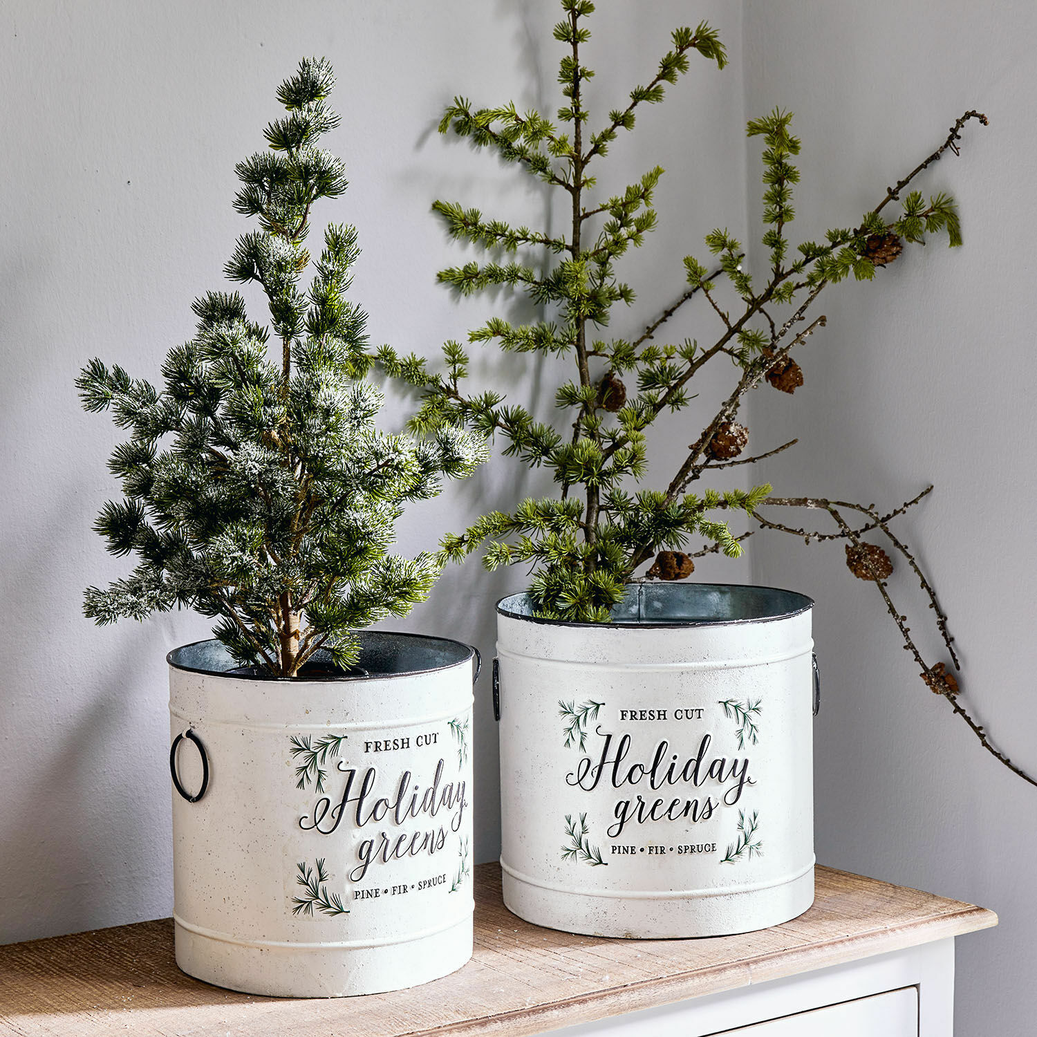 Diese beiden ganz reizenden Übertöpfe zaubern eine wundervolle Winterstimmung in Ihr Heim. Sie bestehen aus Blech und sind kunstvoll bemalt und gestaltet, sodass sie an eine idyllische Weihnachtsbaumfarm erinnern. Freuen Sie sich auf einen stimmungsvollen Country-Look sowie eine tolle Inszenierung von allerlei Pflanzen – ideal zum Landhaus-Stil. Kleine Nadelbäumchen, Christrosen und andere grüne Schönheiten haben darin einen besonderen Auftritt – ein gekonnter Schmuck an der Tür oder auf dem Fensterbrett wie auch auf dem Balkon. Wer möchte, könnte die schönen Übertöpfe auch zum Aufbewahren diverser kleiner Gegenstände nutzen und so charmant Ordnung schaffen. Sie sind in jedem Fall den ganzen Winter über eine Freude.