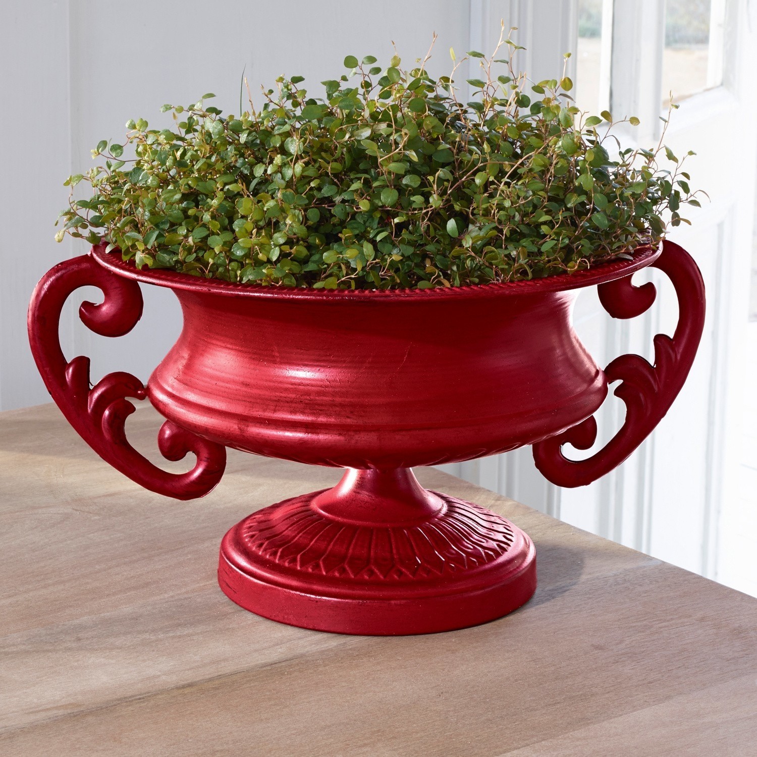 Ein prächtiges Gefäß aus reinem Eisen, mit zwei auffälligen Zierelementen und dezenten Reliefmustern. Der kräftige Farbton bildet einen sehr interessanten Kontrast zur antiken Form. Es kollidieren tatsächlich zwei Design-Sprachen und dennoch wirkt das Ergebnis äußerst harmonisch. Das edle Gefäß hat einfach eine tolle Präsenz, egal, ob bepflanzt, dekoriert oder pur!