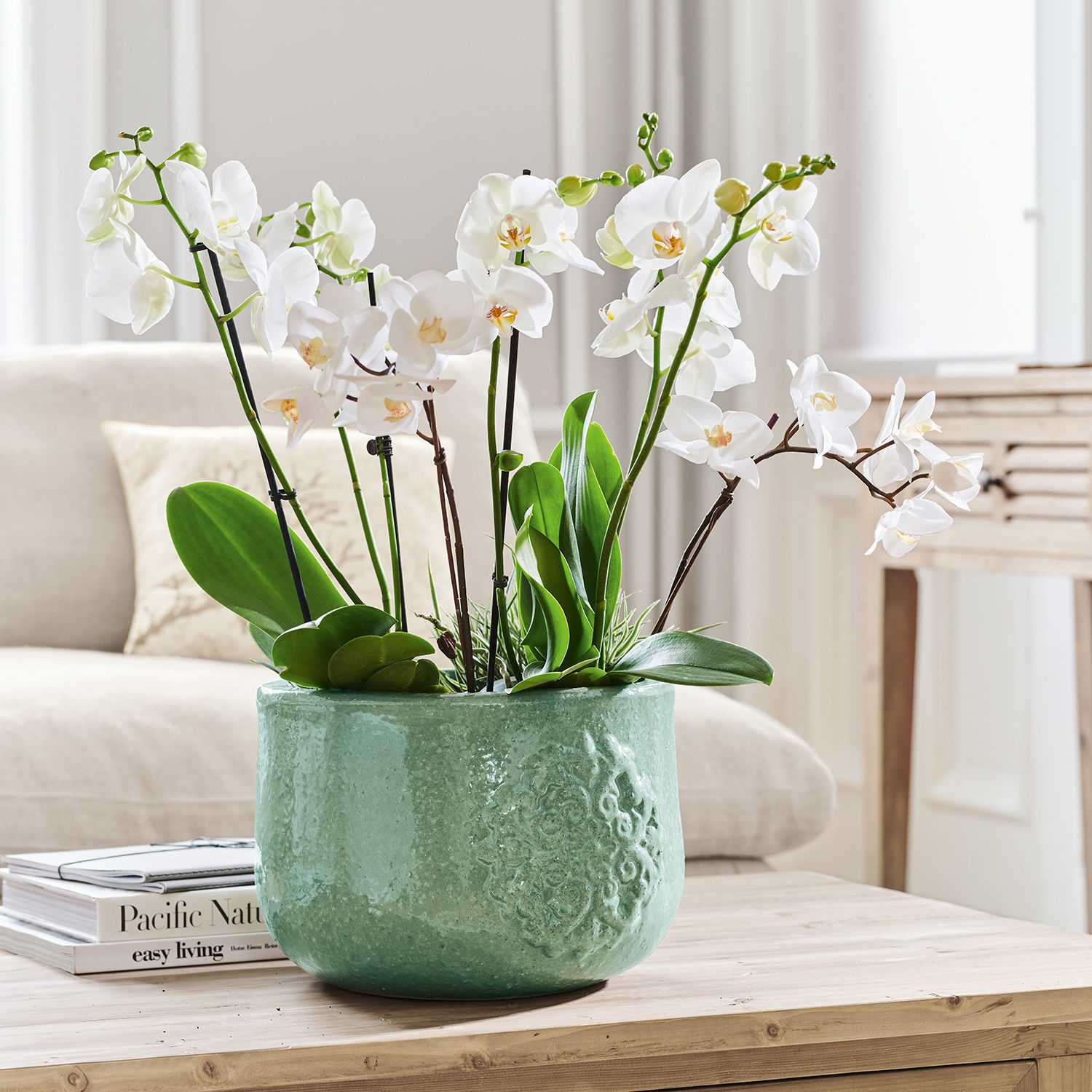 Holen Sie sich mit diesem hübschen Accessoire exotisches Flair nach Hause. Der edle Übertopf aus Keramik ist mit einem aufwendigen, floralen Ornament verziert. Er ist von Hand glasiert, wodurch kleine, charmante Imperfektionen auftreten können. Das langlebige und stabile Modell setzt Blüten und Grünpflanzen wunderhübsch in Szene. Hieran haben Sie in jeder Saison Freude, denn der Übertopf ist wasser- und frostbeständig. Er veredelt Garten, Balkon und Terrasse, sodass Urlaubsstimmung entsteht. Passend dazu erinnert das Design an Mitbringsel aus den Ferien, vielleicht von einem bunten Markt in südlichen Ländern. Auch in Innenräumen gibt er Ihren Pflanzen ein wunderbares Plätzchen, sodass Sie immer die Natur im Haus haben.