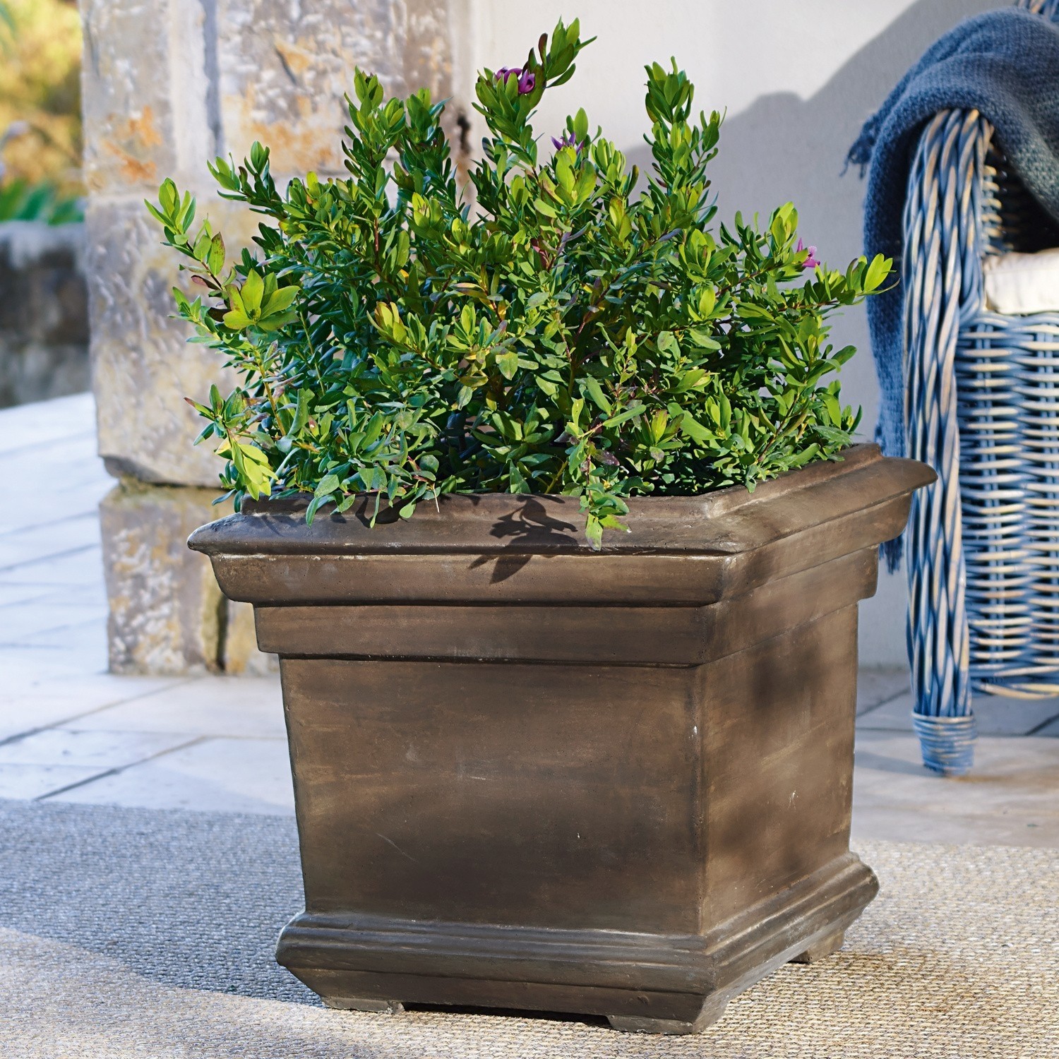 Ob in der Antike oder in den Schlössern der Könige − in Stein geschlagene Skulpturen, Brunnen und Pflanzgefäße zählten schon immer zu den Klassikern. Dieser Übertopf wirkt, als ob er aus einem massiven Stein herausgearbeitet worden wäre. Sein dezent abgestuftes und sehr natürlich wirkendes Design passt zu verschiedensten Stilen sowohl auf dem Balkon oder Garten als auch im Haus. Er wird mit neusten technischen Verfahren hergestellt und besteht aus gebundenem Steinpulver. Beim Verarbeiten wurde darauf geachtet, dass die Oberflächen rau bleiben. Die Steinmischung besteht aus verschiedenen Farbtönen, dadurch wird die Farbstruktur einer echten Steinoberfläche täuschend echt imitiert. Im Innenbereich trumpft er mit seiner robusten, massiven Erscheinung. Wenn Sie den Übertopf im Außenbereich platzieren, kann er sein volles Potenzial entfalten. Er hat eine lebendige, sich wandelnde Oberfläche und altert, wie es bei einem echten Stein der Fall wäre. Durch den Einfluss von Regen und Sonne können sich die einzelnen Steinbestandteile weiterentwickeln und eine natürliche Patina bilden