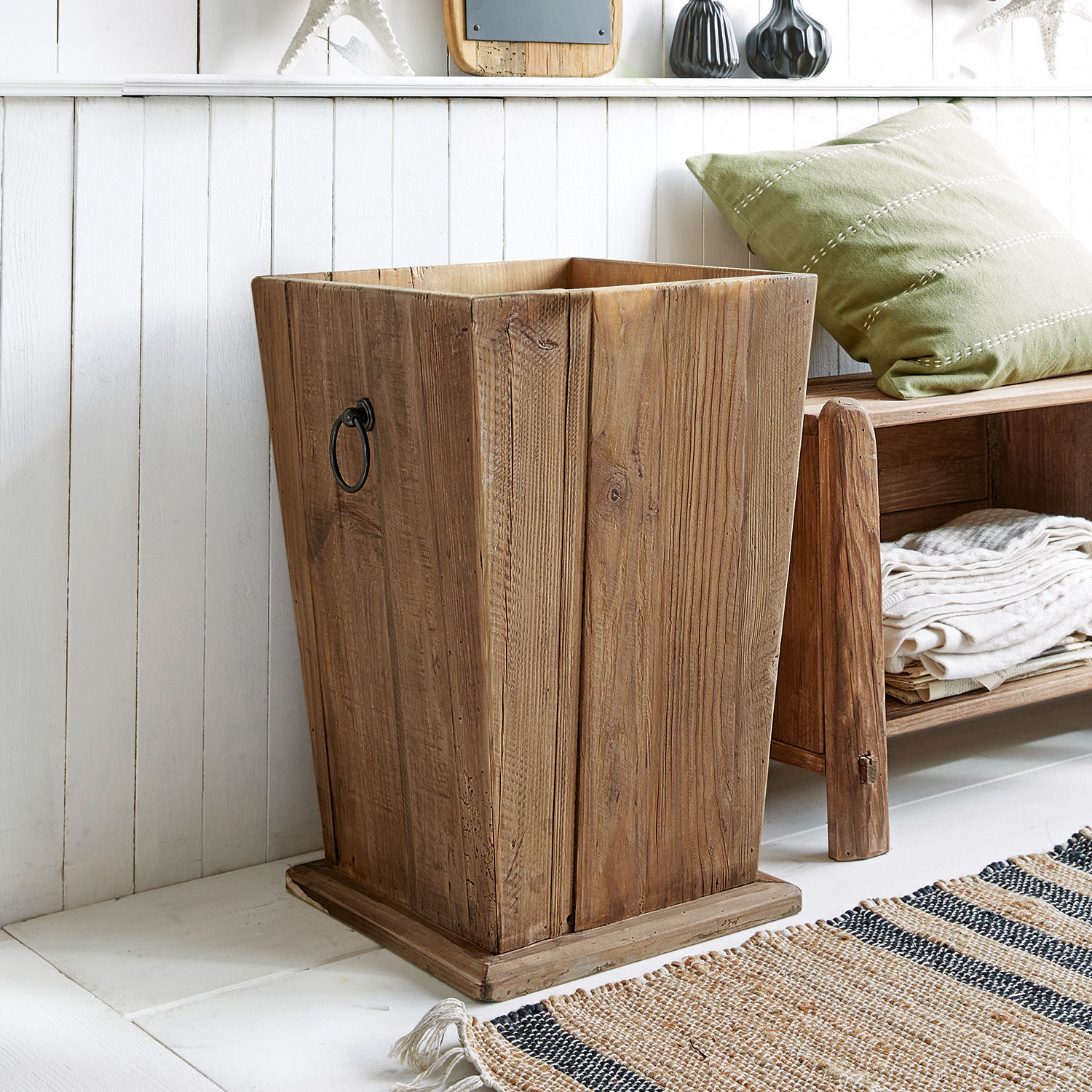 Holz ist nicht gleich Holz. Diese Aussage gilt heutzutage noch mehr als früher, denn neben den verschiedenen Holzarten mischen sich seit einiger Zeit auch wiederaufbereitete Varianten des Naturstoffs ins Möbel-Geschehen. Das heißt, dass aus alten Schränken, Bodendielen, Dachstühlen und Co in einem aufwändigen Prozess neue Möbel und Accessoires entstehen, ohne dass ein Baum sein Leben dafür lassen muss. Neben dem wichtigen Umweltaspekt punktet wiederaufbereitetes Holz aber zugleich mit einer einzigartigen Aura. Kein Wunder also, dass es bei vielen Designern ernsthaft mit frischen Holzarten konkurriert. Dieser Übertopf besteht aus altem Kiefernholz und bringt die unverwechselbaren Spuren seines früheren Lebens mit in das neue Accessoire. Deshalb zeigt der Übertopf die typisch rustikale Oberfläche mit der markanten Maserung, die gerade im Zusammenspiel mit dem sonst eher schlichten Styling ihre volle Wirkung entfalten kann. Die sich nach unten verjüngende, konische Form lässt den rustikalen Topf fast elegant wirken, die beiden ringförmigen Griffe aus Eisen runden den individuellen Auftritt des Übertopfs perfekt ab und helfen zugleich, ihn komfortabel zu transportieren. Und wie Sie es von Deko-Objekten aus wiederaufbereitetem Kiefernholz erwarten können, ist jeder Übertopf ein Unikat mit einem ganz eigenen Charakter.