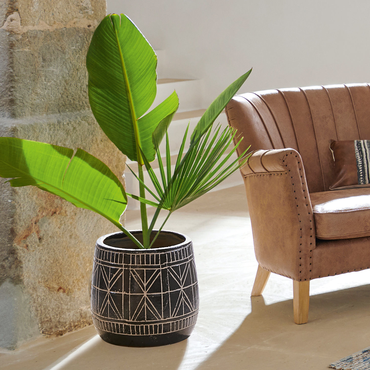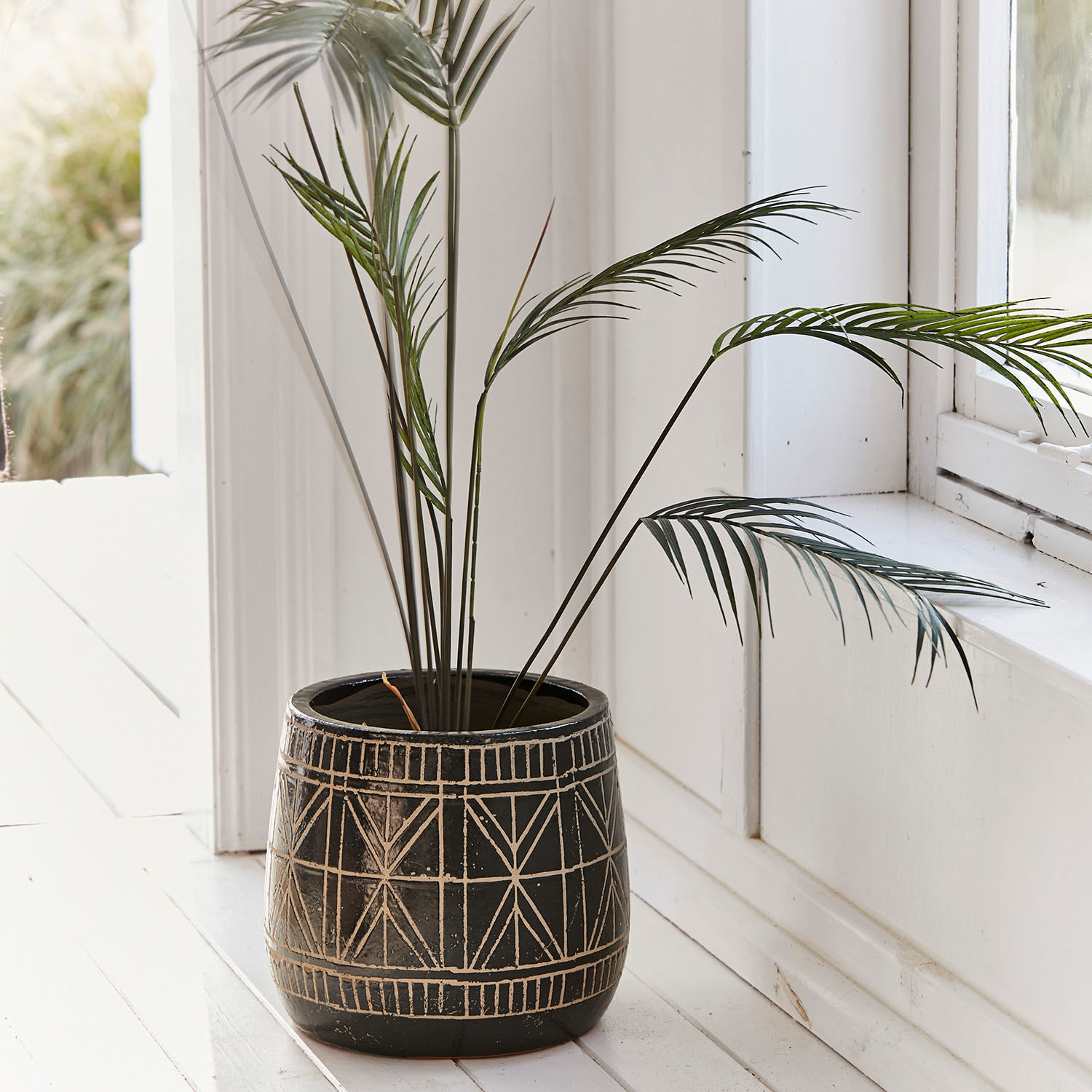 Eine Prise Boho-Flair und Exotik pur – holen Sie sich den Urlaub nach Hause. Der schicke, luxuriöse Übertopf besteht aus handbemalter Keramik. Ein individuelles und vielseitiges Design, welches an ferne Länder erinnert, ziert ihn. Er könnte von einem orientalischen Markt oder aus einem afrikanischen Dorf stammen – gehen Sie bei diesem Anblick einfach gedanklich auf Reisen. Der attraktive Übertopf eignet sich wunderbar für duftende Blüten, Kakteen, Grünpflanzen oder Gräser. Und auch die Kräuter auf der Fensterbank freuen sich über dieses schöne Stück. Auf der Terrasse, dem Balkon oder auch in Innenräumen setzen Sie hiermit einen reizvollen Akzent mit viel Charakter.