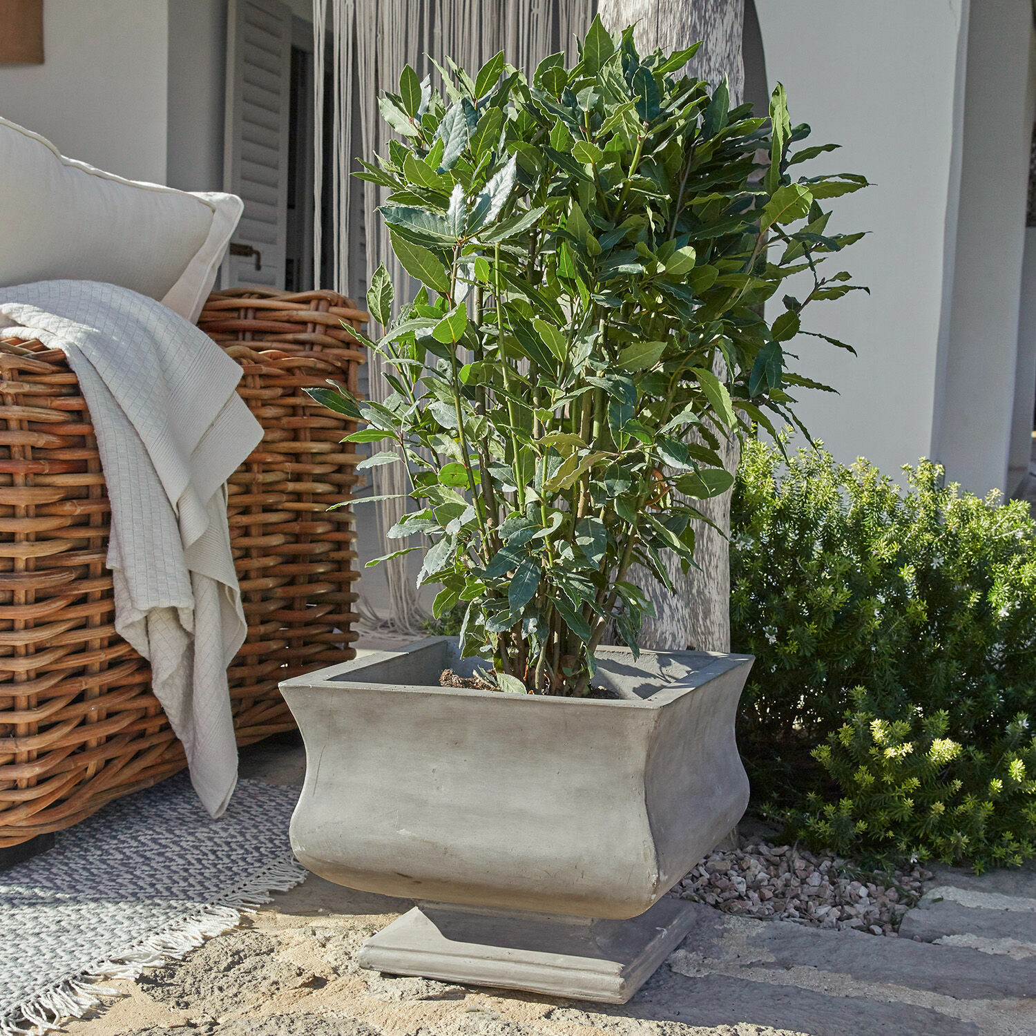 Mit dem imposant großen, ausladend geformten Korpus und dem eckigen Standfuß erinnert der Übertopf an antike Vorbilder, wie sie noch heute in den Gärten alter Palazzi stehen könnten. In einer romantisch verwilderten Ecke, vergessen von den früheren Bewohnern, sind die Jahrhunderte an ihm vorbeigezogen und haben ihre dezenten Spuren auf seiner Oberfläche hinterlassen: ein antikgraues Finish, das wir als wunderschön authentisch empfinden und das seinen nostalgischen Reiz auch in unseren modernen Gärten verbreiten wird. Der Übertopf ist aber nicht aus klassischer Keramik gefertigt, sondern aus modernem Beton, was ihn nicht nur schwer und massiv aussehen lässt, sondern ihm tatsächlich ein stattliches Eigengewicht und damit eine ausgezeichnete Standsicherheit verleiht. Diese ist unverzichtbar ist für ein Accessoire, das den ganzen Sommer draußen im Freien stehen soll. Ob als Übertopf für einen Olivenbaum oder einen aromatisch duftenden Rosmarinbusch, ob von einer Rose oder einer prachtvollen Zimmerpflanze bewohnt – dieser Topf wird die Schönheit jeder Pflanze stilvoll unterstreichen.