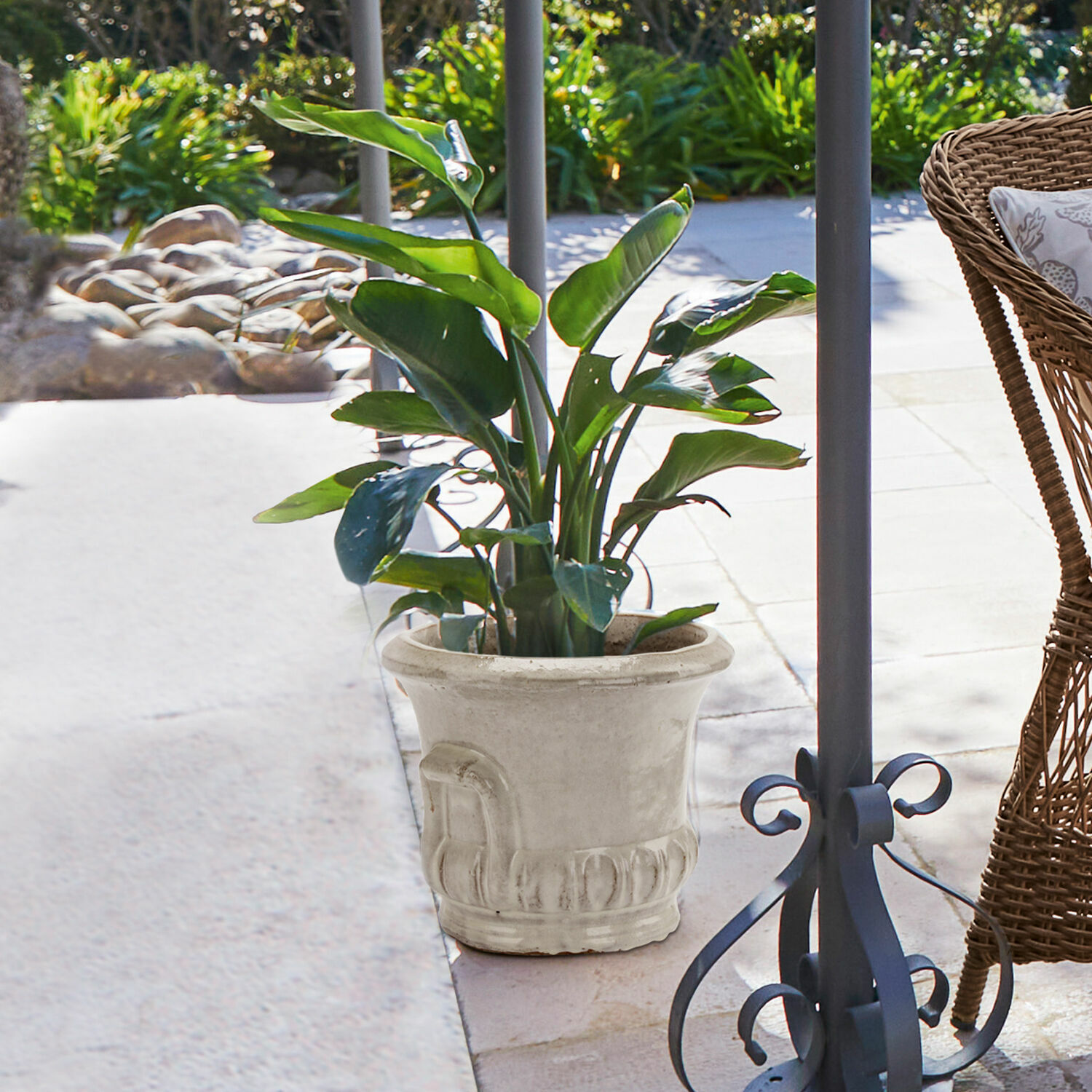 Holen Sie sich mediterranes Flair nach Hause und freuen Sie sich über ein luxuriöses Design mit Unikat-Charakter. Denn jeder der schönen und hochwertigen Übertöpfe aus schwerem Steingut ist von Hand gearbeitet. Dadurch weist jedes Stück ein ganz eigenes Finish und seine eigene Farbvariation auf. Charmante Merkmale der Handverarbeitung geben ihm noch mehr Charakter. Das stabile Design hat ein Loch zum Wasserablauf und ist sehr langlebig. Hierin finden Gräser, Pflanzen und Palmen das perfekte Plätzchen und verwandeln Räume, Terrasse, Balkon oder Garten in ein Paradies mit Mittelmeer-Charakter. Die antike Note passt besonders gut zum einem Ambiente im Shabby-Chic und macht Ihnen viele Jahre lang immer wieder Freude. Das Schmuckstück sollte innen oder überdacht genutzt werden, damit es lange so attraktiv aussieht.