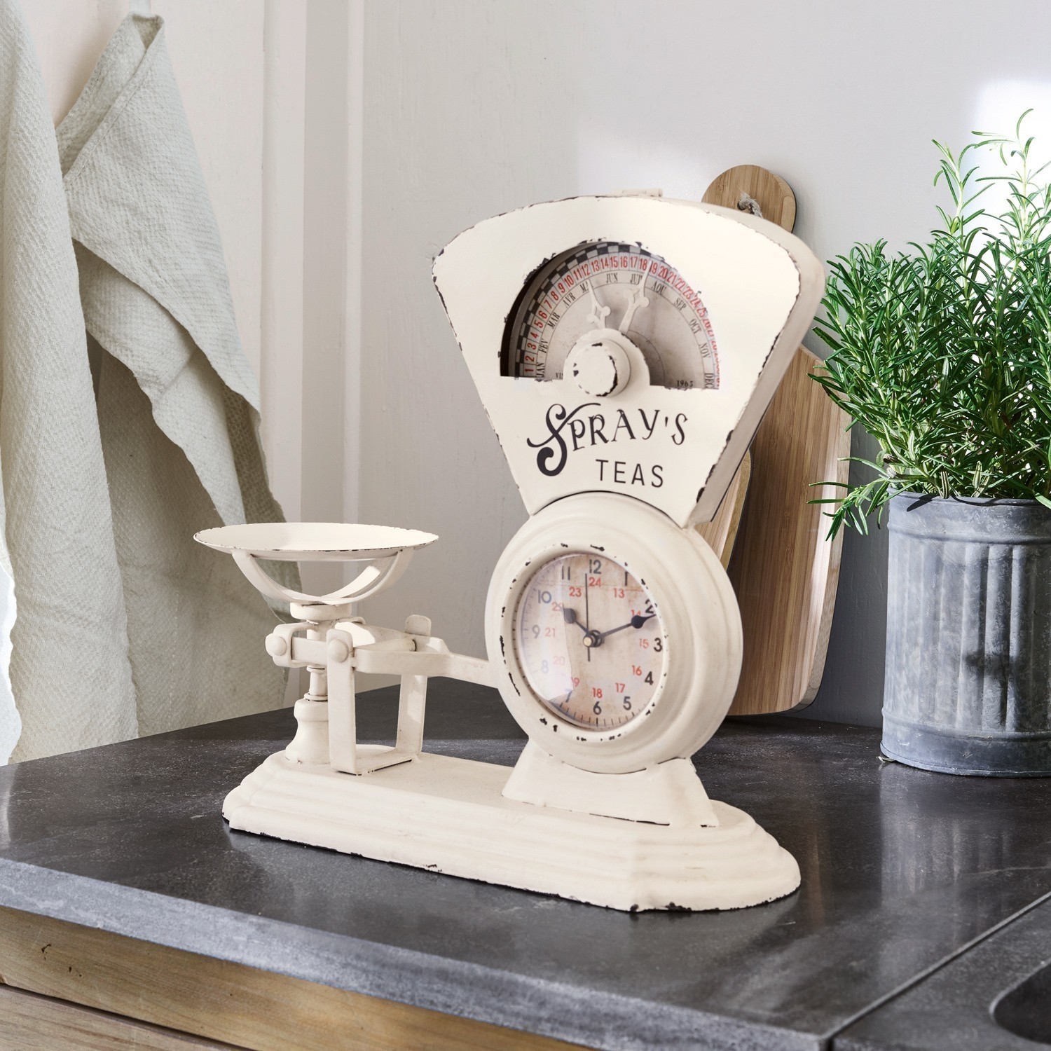 Den unvergleichlichen Charme eines alten Krämerladens strahlt dieses zauberhafte Objekt aus. Zunächst scheint es, als handele es sich um eine alte Waage für Mehl und andere Lebensmittel. Erst bei genauerem hinschauen entpuppt sich das zauberhafte Teil als eine Uhr. Die hochwertige Fertigung aus Eisen und Glas lässt das hübsche Stück umso authentischer wirken. Das Vintage-Design macht diesen einzigartigen Klassiker zu einem dekorativen Highlight in Räumen im Shabby-Chic oder im Landhaus-Stil. Nach der Uhrzeit zu schauen war womöglich noch nie so schön.