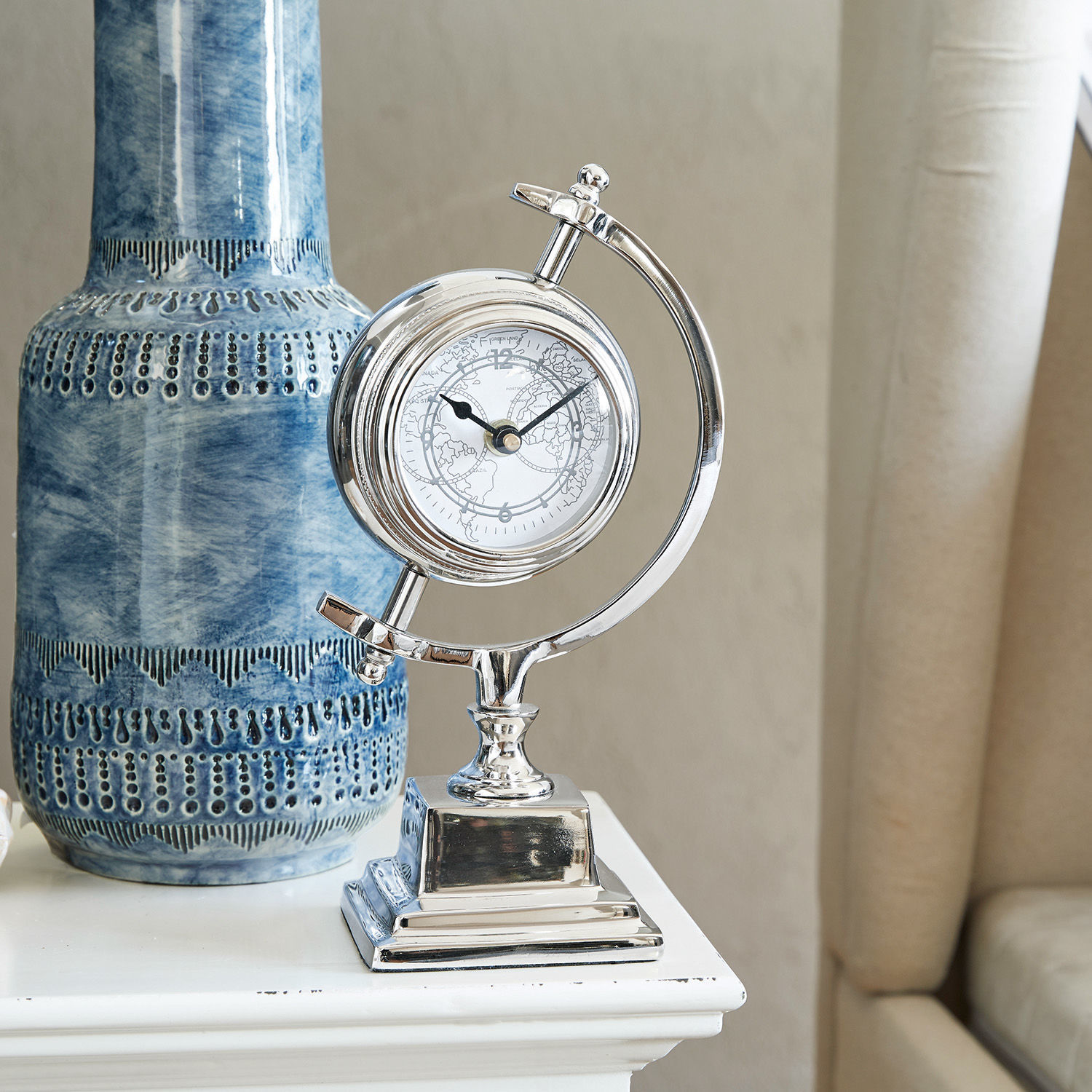 Klassische Nostalgie im edlen Design – diese kunstvolle Uhr zieht alle Blicke auf sich. Sie können daran nicht nur bestens ablesen, was die Stunde geschlagen hat, sondern sich auch über eine geschmackvolle Dekoration im Stile der großen Weltentdecker freuen. Das von einem Globus inspirierte Design wird durch das mit einer Weltkarte verzierte Ziffernblatt perfekt ergänzt. Es ist von einem formschönen, glänzenden Gestell sowie einem edlen Sockel eingerahmt. Die detailreiche Uhr macht sich sehr gut im Arbeitszimmer oder als Zierde im Wohnzimmer. Das geschmackvolle und außergewöhnliche Modell vereint Funktion und Dekoration ideal. Es wird mit einer Batterie betrieben.