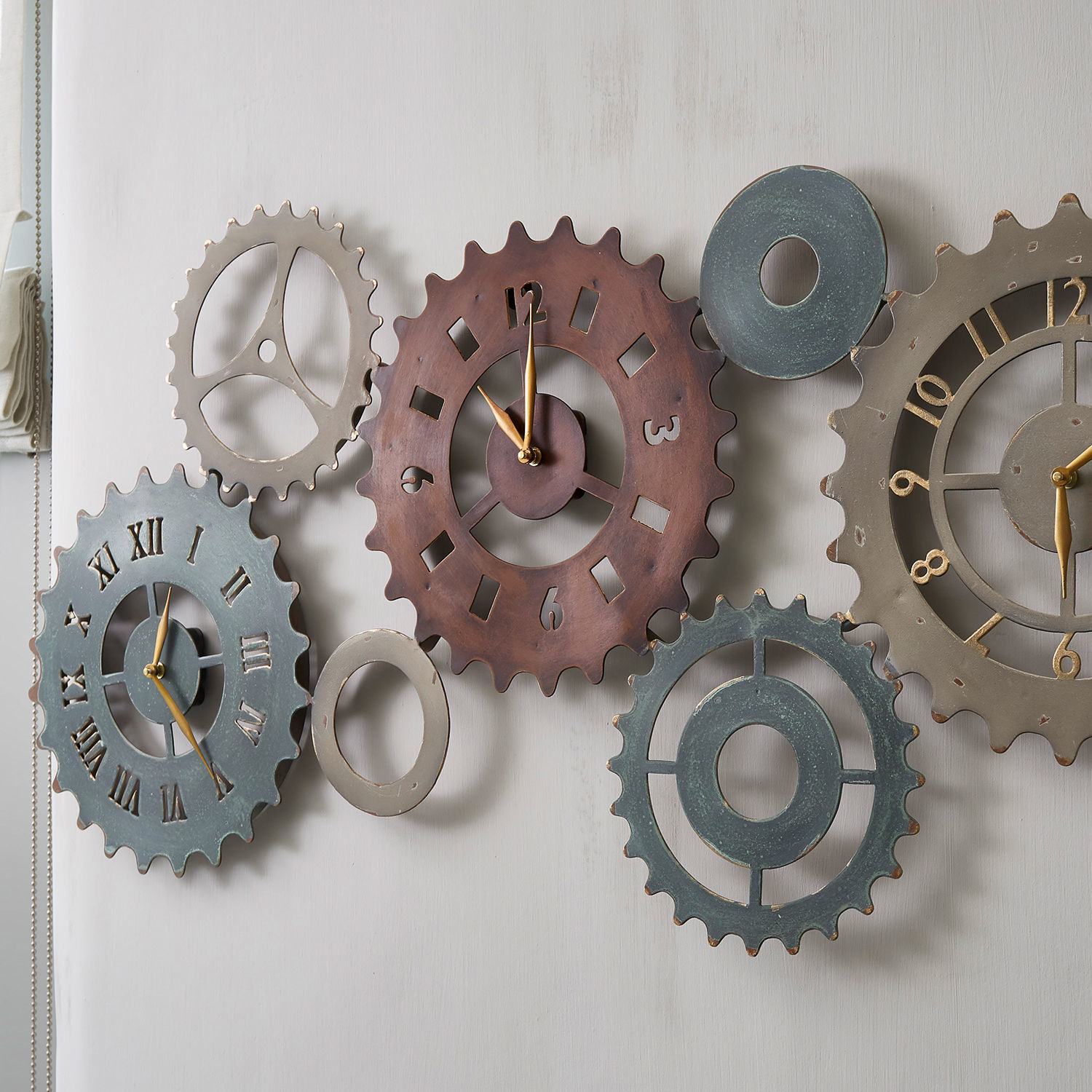 Wahrlich ein Blickfang im raffinierten Industrial-Stil. Dieses große, außergewöhnliche Design ist ein kunstvolles Gebilde im Industrial-Stil. Es ist von der Optik alter Zahnräder inspiriert und wirklich ein Accessoire, welches man so nicht überall sieht. Die Zahnräder sind zudem mit einem eleganten Antik-Finish überzogen und zeigen dadurch noch mehr Charakter. Perfekt für alle, die es individuell lieben und wirklich nie verpassen wollen, was die Stunde schlägt. Denn das schicke Design vereint gleich drei Uhren in einer. Eine zeigt normale Zahlen, eine andere ist mit römischen Ziffern geschmückt. Die dritte Uhr weist vier Zahlen sowie Aussparungen auf. Das Schmuckstück lässt sich an der Wand aufhängen, wo es einen attraktiven Wandschmuck abgibt. Es ist eine gekonnte Wahl zu einem edlen Industrial-Ambiente mit viel Holz und Eisen. Die drei Uhren werden mit Batterien betrieben.