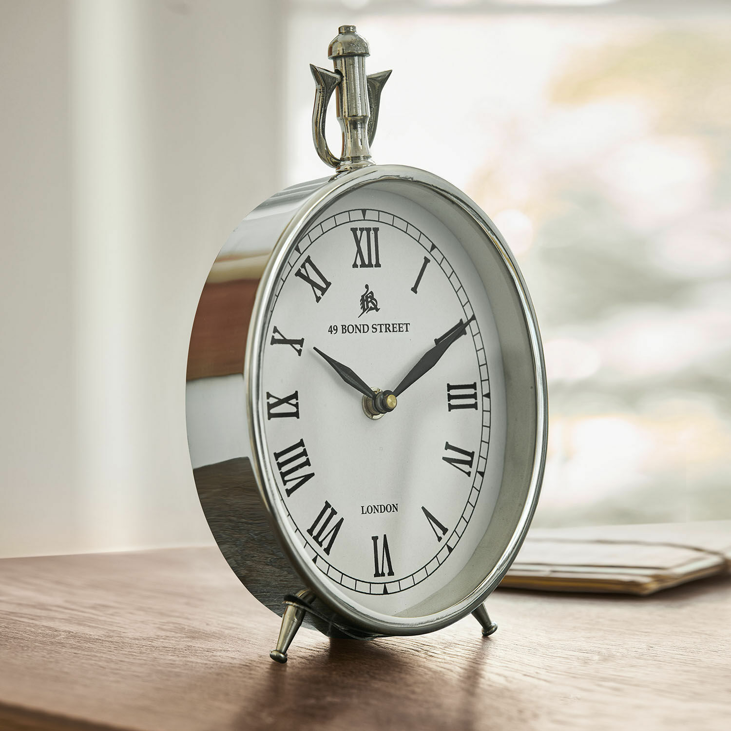 Diese Uhr ist genauso wunderschön wie vielseitig. Sie kann auf den Schreibtisch oder die Kommode gestellt werden, verfügt aber auch über eine formschöne Öse zum Aufhängen. Bei der Herstellung kommen nur hochwertige Materialien zum Einsatz, so ist das Gehäuse aus Stahl geformt und auch das Ziffernblatt besteht aus kunstvoll gearbeitetem Metall. Römische Ziffern unterstreichen den Vintage-Charme. Selbstverständlich wird das Ziffernblatt nicht von einer Plastikscheibe, sondern von echtem Glas geschützt. Im Inneren tickt präzise und langlebige Quarztechnologie.