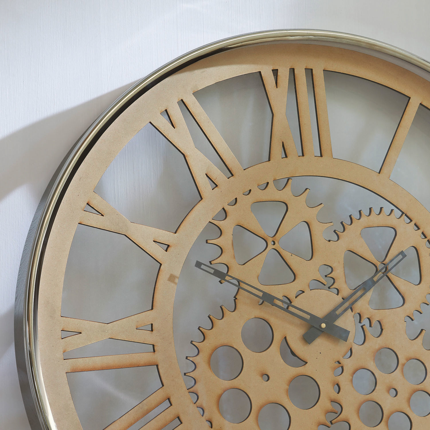 Verschönern Sie Ihr Zuhause und bringen Sie Ihre Individualität mit dieser außergewöhnlichen Wanduhr zum Ausdruck. Das Ziffernblatt ist aus Metall gestanzt und mit Zahnrädern dekoriert, die den klassischen Industriestil der Uhr unterstreichen. Denn in diesem Stil reduziert sich alles aufs Wesentliche und unverfälscht Rohe. So wird durch die Zahnräder das Innenleben der Uhr dargestellt und nicht hübsch durch eine Abdeckung versteckt. Der metallisch glänzende Rand bildet einen tollen Kontrast zum hellen Finish und den dunklen Zeigern. Die Front ist verglast, um die Uhr vor Schmutz und ähnlichem zu schützen. Das ganggenaue Quartz-Uhrwerk rundet diese hochwertig designte Wanduhr perfekt ab.