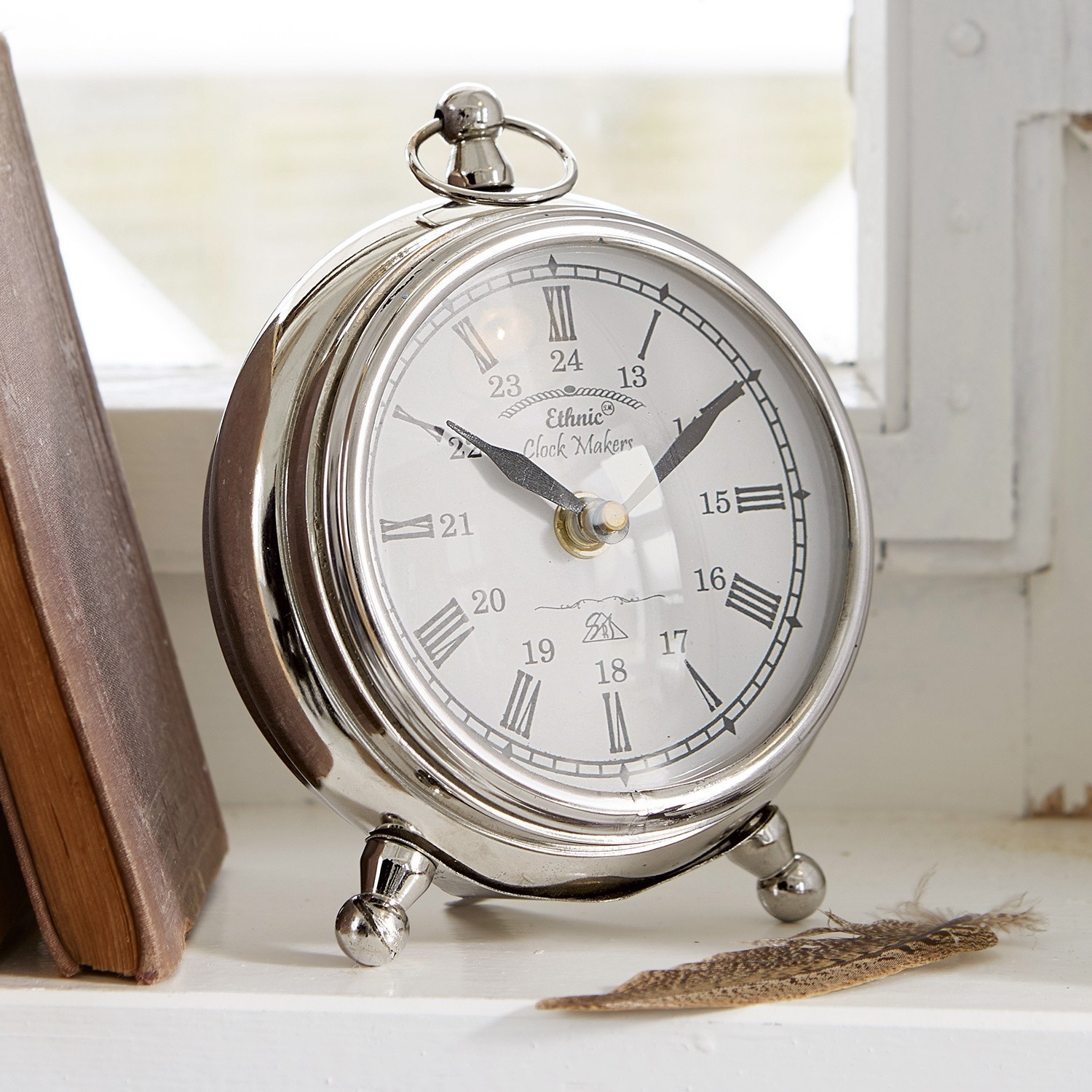 Ein geschmackvolles Design mit antiker Anmutung, die durch die stilechte Formgebung und die Verwendung römischer Ziffern entsteht. Die Uhr besteht aus Aluminium und Stahl, die Abdeckung aus Glas. Ein Quarzuhrwerk zeigt immer exakt an, was die Stunde geschlagen hat. Holen Sie sich das Gefühl der guten alten Zeit zurück und setzen Sie mit diesem stilvollen Accessoire raffinierte Akzente. Das edle Modell wird mit einer Batterie betrieben. Hinten befindet sich ein kleiner Metallfuß, so dass es gut aufzustellen ist. Handliche Maße machen es auch für kleine Räume ideal, ob im Schlafzimmer auf dem Nachttisch, auf dem Schreibtisch oder in anderen Räumen platziert. Das Modell wirkt wie ein Schatz vom Flohmarkt oder ein Fundstück aus einer längst vergangenen Ära. Genießen Sie zeitlose Eleganz, die den Trubel der modernen Welt für einen Moment vergessen lässt. Ebenso dekorativ wie nützlich.