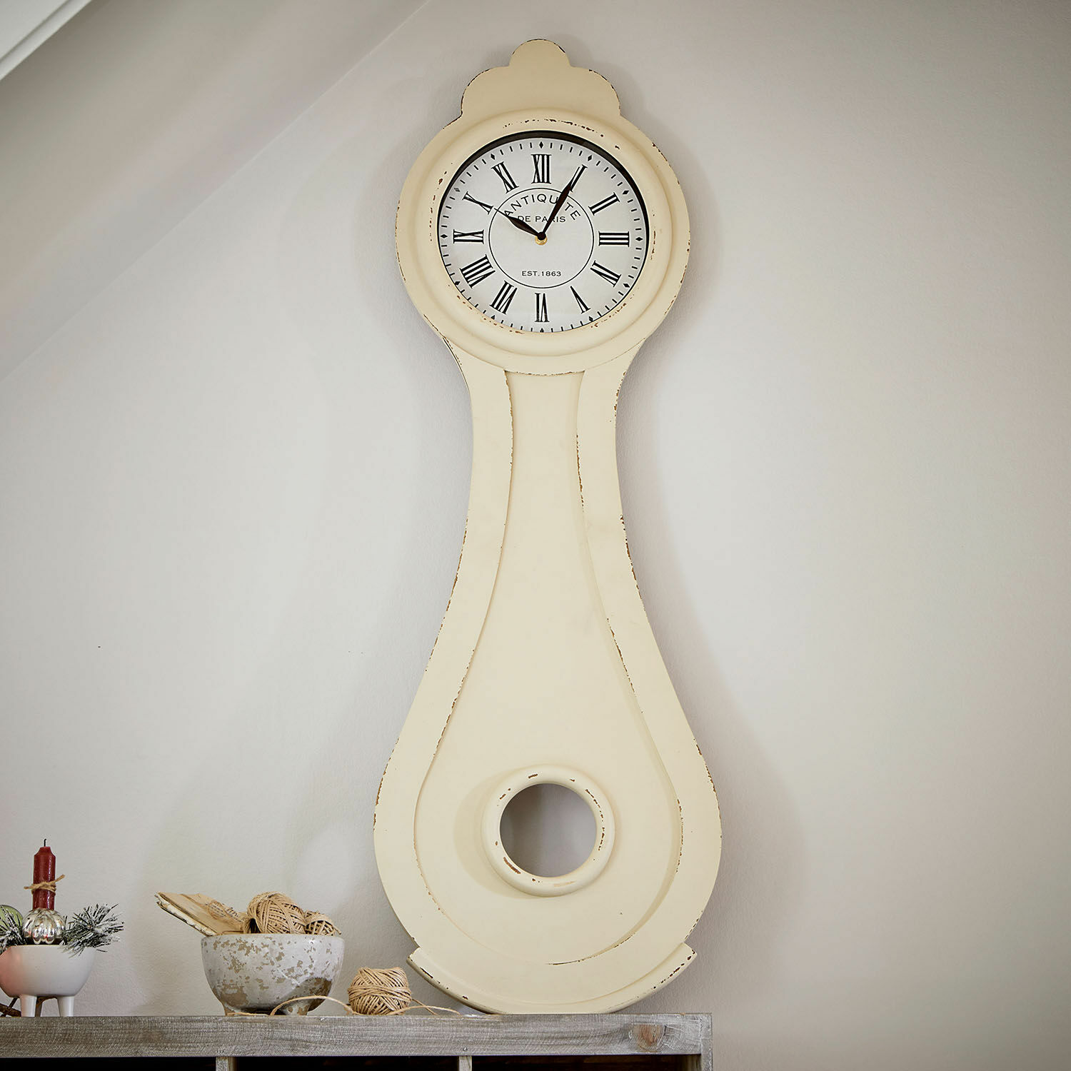 Haben Sie Freude an nostalgischem Flair und an ein wenig Retrozauber in Ihren Räumen? Dann ist der Griff zu dieser zauberhaften Uhr im Shabby Chick genau das Richtige. Das schöne Schmuckstück ist weitaus mehr als nur ein Zeitmesser. Als reizendes Deko-Objekt ist es eine Bereicherung für jede Wand. Es wird einfach an eine Wand gelehnt und begeistert dort alleine durch seine Anwesenheit. Das Design erinnert ein wenig an die einzigartige Optik alter Händlergeschäfte mit Regalen voller liebenswertem Allerlei, großen Truhen und kleinen Kästchen mit Schmuck. Man hat unweigerlich den Eindruck, dieses traumhaft schöne Möbelstück hätte die Zeit überdauert und vielleicht auf dem Dachboden eines alten Hauses ein Jahrhundert verbracht. Vintage-Charme, wie er schöner nicht sein könnte. Die Uhr ist gänzlich aus Holz und mit einem traumhaften Antik-Finish überzogen, das den Vintage-Charakter noch zusätzlich betont. Die Uhr an sich ist ganz klassisch gehalten und mit hübschen römischen Ziffern versehen. Schützend davor liegt eine Glasschicht. Verwenden Sie die Uhr vielleicht in Ihrer Küche oder setzen Sie Akzente in Flur oder Wohnzimmer.