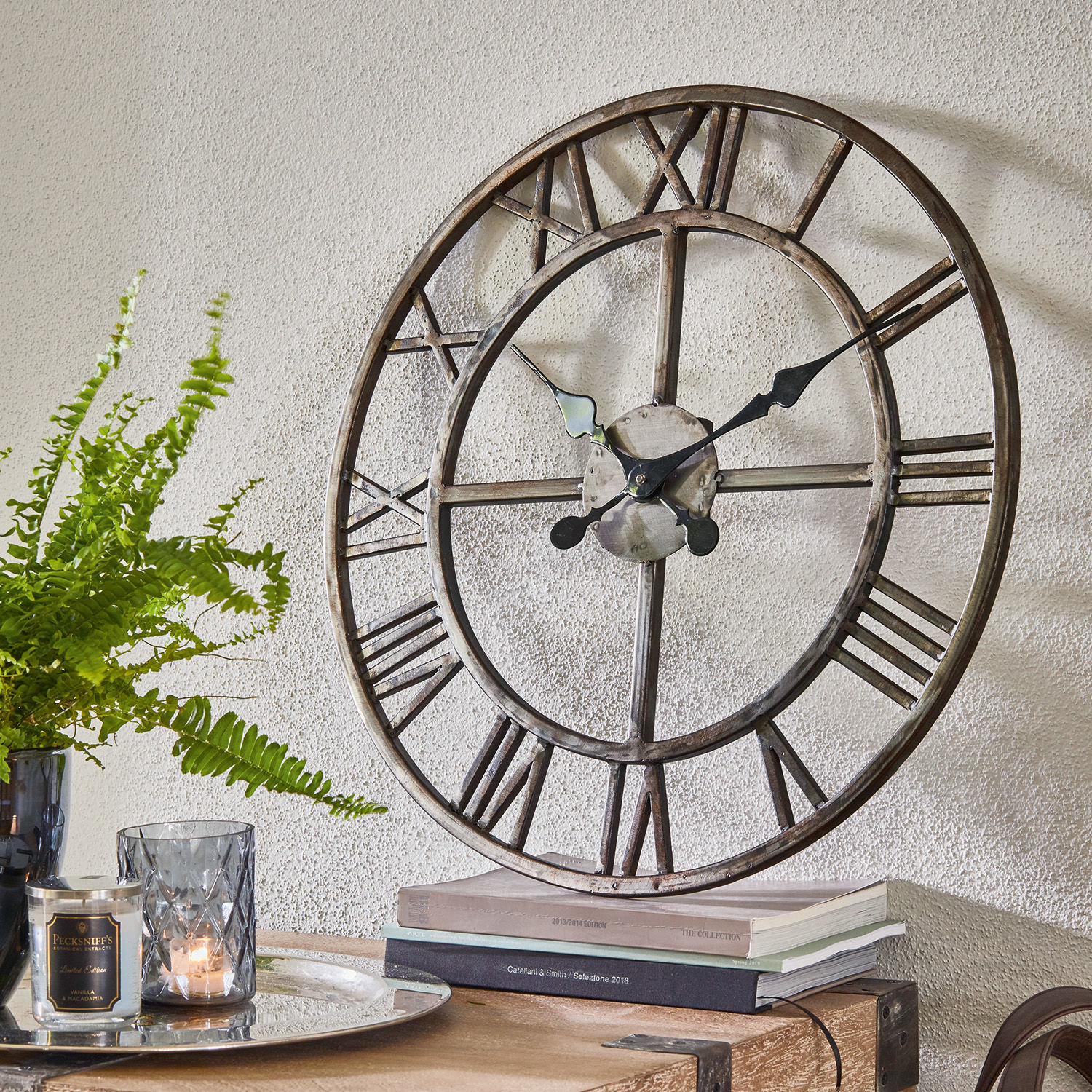 Schlichtweg schön – dieser Ausdruck kommt nicht von ungefähr. Denn oft führt das konsequente Weglassen von Überflüssigem zu überraschend dekorativen Effekten. Sie sind noch nicht überzeugt? Dann schauen Sie sich diese Wanduhr an. Sie besteht einzig und allein aus den Grundelementen einer Uhr, und zwar aus zwei Zeigern und dem typischen Zahlenkranz, über den die Zeiger ihre Runden drehen, Stunde um Stunde, Tag um Tag. Sogar auf die Rückwand wurde verzichtet, so dass die Zeiger quasi über die Wand wandern. Mit einem interessanten Nebeneffekt: Die Uhr wird in jedem Raum, vor jedem Hintergrund ein wenig anders wirken, auch wenn sie selbst kein Einzelstück ist. Und so puristisch wie die Gestaltung ist auch die Wahl des Materials: Zeiger und Stundenkranz bestehen aus massivem Eisen, das mit einer antiken Patina veredelt wurde. Puristisch heißt aber niemals ohne Anspruch an die ästhetische Wirkung des Produkts. Deshalb ist die Uhr bis ins Detail mit großer handwerklicher Sorgfalt gefertigt, wie es typisch ist für Deko-Objekte mit Industrial-Anmutung. Um die beeindruckende Ausstrahlung der Uhr nicht zu stören, wurde das moderne Quarzwerk unsichtbar hinter der Eisenscheibe platziert, die die Zeiger hält.