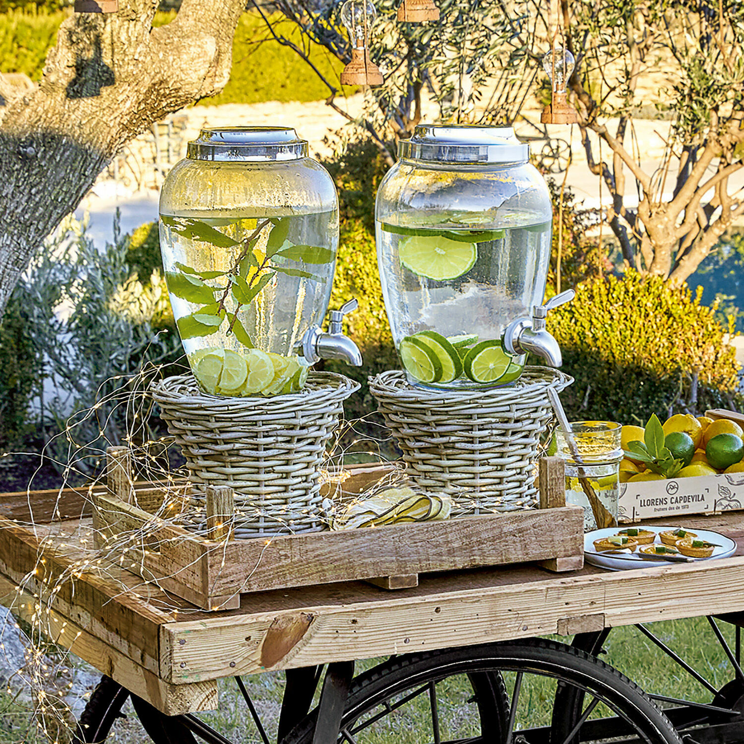 Wer möchte einen kühlen Saft? Wenn Ihre Gäste diese Frage bejahen, werden Sie bald zu Ihrem Getränkespender gehen, eines der bereitstehenden Gläser darunter halten und den Saft ins Glas laufen lassen. Das geht so problemlos, weil der Getränkespender erhöht auf einem kleinen Podest steht. Ca. 18,5 cm hoch ist der Untersetzer, aber absolut ausreichend, um dem Spender die benötigte Höhe fürs komfortable Handling zu geben. Darüber hinaus haben Sie hier ein Accessoire, bei dem sich ein ausdrucksstarkes Naturmaterial und eine traditionelle Handwerkskunst perfekt ergänzen. Für den Untersetzer wurden die kräftigen Fasern der Rotang-Palme, die ihre Heimat in den tropischen Regenwäldern Asiens hat, von den erfahrenen Händen eines Korbmachers sorgfältig um ein stabiles Eisengestell geflochten, das für einen sicheren Stand und lange Haltbarkeit sorgt. Natürlich können Sie den Untersetzer auch für andere Deko-Ideen im Haus oder auf der Terrasse einsetzen, zum Beispiel für ein größeres Windlicht, einen Blumentopf, einen rustikalen Krug oder, oder, oder.