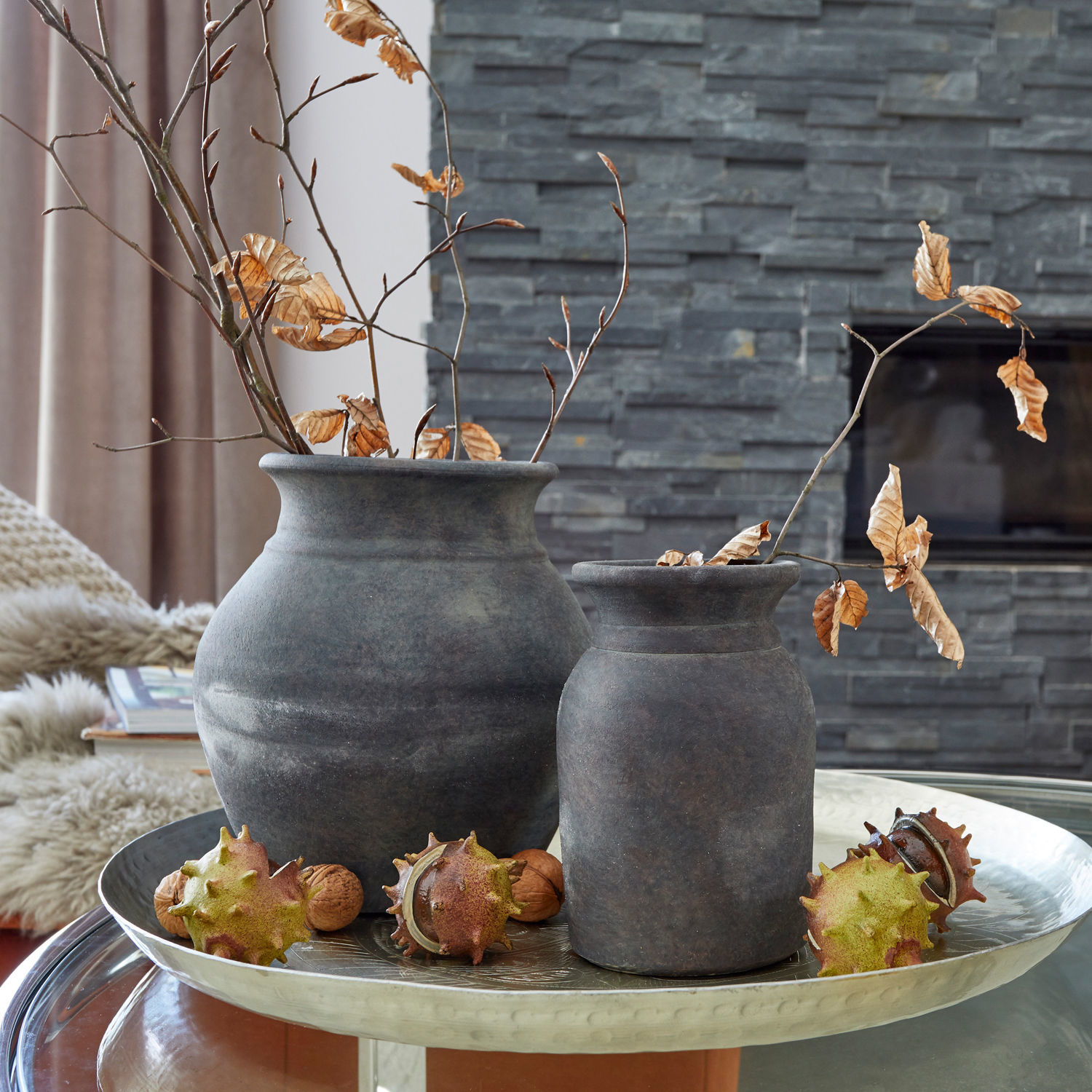 Das zweiteilige Vasen-Set besteht aus einem hochwertigen Terrakotta. Bei der handwerklichen Gestaltung hat man sich auf das Wesentliche konzentriert. Und diese Schlichtheit steht den beiden funktionalen Dekostücken sehr gut. Der rustikale Chic wird von der dunklen Oxidations-Patina in matter Optik getragen, die bei jeder Vase leicht individuell ausfällt. Ob nebeneinander dekoriert oder als einzelnes Accessoire arrangiert, sie fallen auf. Das liegt vor allem an den vielschichtigen erdigen Nuancen. Dieses große Farbspektrum gedeckter Töne lässt sich wunderbar mit dem Shabby Chic kombinieren. Und auch der Greenery-Trend mit all seinen Pflanzen kann von schicken Vasen nicht genug bekommen. Einzelne Zweige und andere Trockengestecke – das Set wird je nach Dekoration zu einer ganz eigenen Präsentationsfläche. Umso besser, da die Vasen in den dunklen Farbtönen unterschiedlich in Aussehen und Höhe designt wurden.