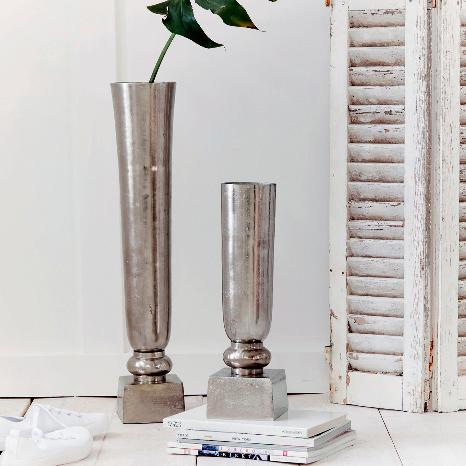 Zwischen purer Sachlichkeit und zeitloser Eleganz sind es nur Nuancen. Genau in diesem anspruchsvollen Bereich bewegen sich die beiden stilvollen Vasen, die jeder Einrichtung ein unverwechselbar feines Lebensgefühl einhauchen. Das 2er Set aus Aluminiumguss bietet mit seinen unterschiedlichen Größen und der schlanken, kelchförmigen Optik echten Glamour-Faktor. Dazu passt auch wunderbar die silberfarbene Antik-Beschichtung mit ihrem dezenten Glanz. Der markante Fuß in Carré-Form vollendet die Vase und verleiht einen festen Stand. Ihren Deko-Ideen sind keine Grenzen gesetzt – schon pur versprechen sie auf Ihrem Sideboard eine großartige Wirkung. Mit Zweigen oder einer langstieligen Kunstblume kreieren Sie ein Stillleben, das alle Blicke auf sich zieht. Zu natürlichen Holzmöbeln und Wohn-Accessoires aus Leder, Rattan oder Bast setzen sie einen spannenden Kontrapunkt. Da die Accessoires nicht frostbeständig sind, sollten sie nur im Innenbereich eingesetzt werden.