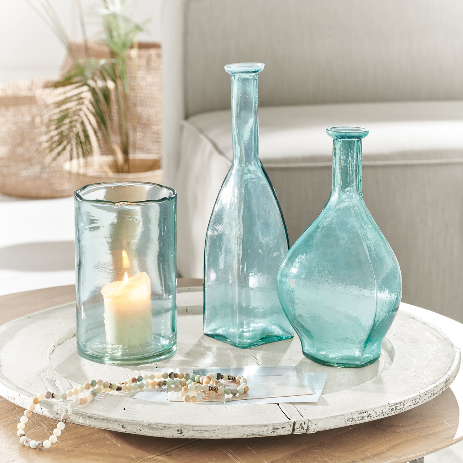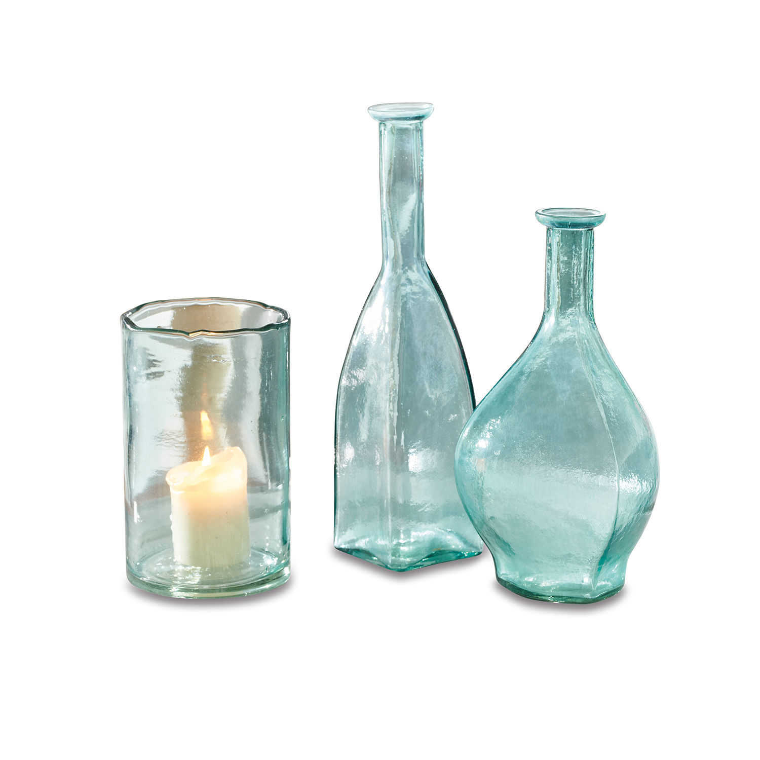 Ein Trio mit viel Vintage-Charme kommt mit diesem harmonischen Set in ihr Zuhause. Die drei Vasen aus Glas sind alle unterschiedlich in Form und Größe, sodass sich eine abwechslungsreiche und doch stimmige Optik ergibt. Das Glas ist bewusst uneben designt, um eine besondere Anmutung zu schaffen – eine reizvolle Struktur. Sie erinnern an Fundstücke aus Großmutters Haus und passen sehr gut zum Shabby-Chic. Arrangieren Sie darin liebevoll duftende Blumen, Wiesenblüten, Gräser oder auch Trockenblumen und zaubern Sie in jeder Saison einen Hauch Romantik in Ihre Räume. Gemeinsam oder einzeln platziert entsteht so ein stilvolles Bild. Auch auf dem Balkon machen die formschönen Vasen sich bestens.