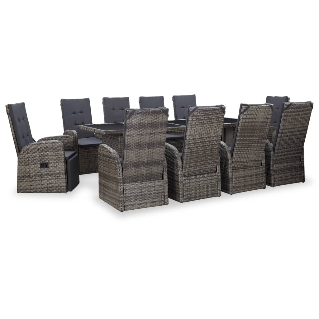 Diese stilvolle Poly Rattan Essgruppe wird der Hingucker in Ihrem Garten oder auf Ihrer Terrasse sein! Diese Garten-Essgruppe aus Poly-Rattan hat ein elegantes, modernes Design und ist eine hervorragende Wahl für Ihre Mahlzeiten im Freien oder einfach nur zum Entspannen im Garten. Aus wetterbeständigem und wasserdichtem PE-Rattan gefertigt, ist die Essgruppe leicht zu reinigen, strapazierfähig und für den täglichen Gebrauch geeignet. Die pulverbeschichteten Stahlrahmen machen Tisch und Stühle stark und robust. Die Tischplatte ist aus Glas gefertigt und lässt sich daher ganz einfach sauber machen. 2 der Stühle sind verstellbar, da sie über verstellbare Rückenlehne verfügen. Durch Berühren der Taste an der Seite neigt sich die Rückenlehne nach hinten. Dank ihrer Leichtbauweise lassen sich alle Teile leicht umstellen.Die dicken und weichen, mit Schaumstoff gefüllten Sitzkissen sind äußerst komfortabel und mit wasserabweisendem Polyester bezogen. Die Polsterbezüge mit Reißverschlüssen können leicht entfernt und gewaschen werden. Hinweis: Wir empfehlen, das Set bei Regen, Schnee oder Frost abzudecken.