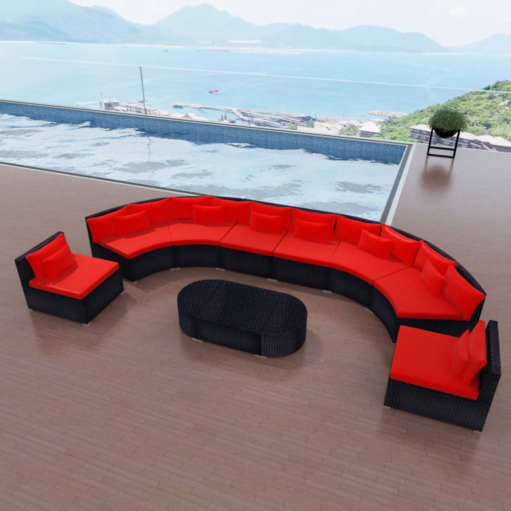 Diese großzügige Sofagarnitur aus Rattan kombiniert Stil mit Funktionalität und wird schnell zum Mittelpunkt Ihres Gartens oder Ihrer Terrasse werden. Dieses Möbel-Set ist so entworfen, dass es das ganze Jahr über im Freien genutzt werden kann. Dank des witterungsbeständigen und wasserfesten Polyrattan ist dieses Lounge-Set leicht zu reinigen, strapazierfähig und für den täglichen Gebrauch bestens geeignet. Die Sitzgarnitur zeichnet sich durch einen stabilen, pulverbeschichteten Stahlrahmen aus, der für Langlebigkeit und Robustheit sorgt. Es ist modular aufgebaut und dadurch leicht umzustellen, weshalb es an jede Umgebung flexibel angepasst werden kann. Die dicken, abnehmbaren Polster sind sehr bequem. Mittels Reißverschlüssen können die Bezüge leicht entfernt und gewaschen werden. Der Lieferumfang beinhaltet 4 gerade Sofaelemente, 4 abgerundete Sofaelemente, 1 quadratischen Couchtisch, 2 halbrunde Beistelltische, 10 Kissen, 8 Sitz- und 12 Rückenpolster. Hinweis: Wir empfehlen, das Gartensofa-Set bei Regen, Schnee oder Frost abzudecken.