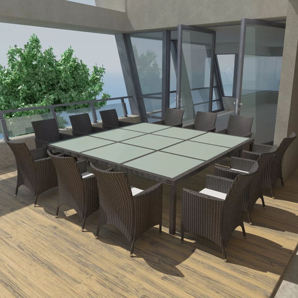 Diese 12-Personen-Essgruppe verfügt über ein elegantes Design und besteht aus 1 Tisch und 12 Stühlen. Unser Rattan-Gartenmöbel-Set wird zum Mittelpunkt Ihres Gartens oder Terrasse! Dank pulverbeschichteten Stahlrahmen sind der Tisch und die Stühle nicht nur sehr robust und stabil, sondern ermöglichen obendrein aufgrund der Leichtbaukonstruktion ein einfaches Umstellen dieser Gartenmöbel. Dank des witterungsbeständigen und wasserdichten PE-Rattans ist das Gartenmöbel-Set leicht zu reinigen. Die dicken, weichen Sitzpolster mit vertikaler Baumwollfaserfüllung sind sehr bequem. Die Polsterüberzüge mit verdeckten Reißverschlüssen können abgenommen und gewaschen werden. Im Lieferumfang enthalten: 1 Tisch mit Glasplatte, 12 Rattan-Stühle und 12 Sitzpolster. Hinweis: Wir empfehlen, das Set bei Regen, Schnee oder Frost abzudecken.