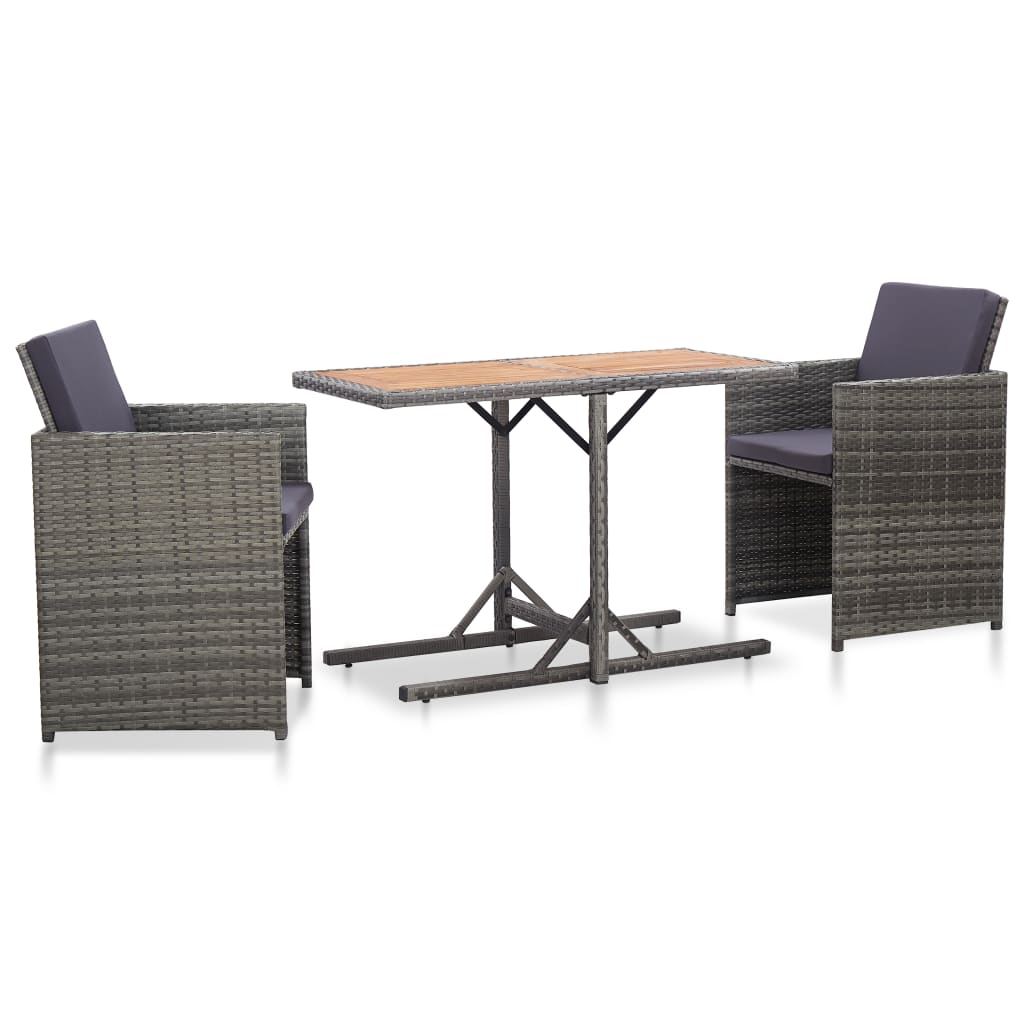 Diese stilvolle Rattan-Essgruppe wird der Hingucker in Ihrem Garten oder auf Ihrer Terrasse sein! Diese Rattan-Essgruppe im eleganten, modernen Design ist eine ausgezeichnete Wahl für Ihre Mahlzeiten im Freien oder einfach nur zum Entspannen im Garten. Aus wetterbeständigem und wasserdichtem PE-Rattan gefertigt, ist die Essgruppe leicht zu reinigen, strapazierfähig und für den täglichen Gebrauch bestens geeignet. Die Stahlrahmen verleihen dem Tisch und den Stühlen Stabilität und Langlebigkeit. Dank der Leichtbaukonstruktion sind alle Möbelteile einfach zu umstellen. Die Tischplatte aus Holz kann mühelos mit einem feuchten Tuch gereinigt werden. Die dicken, weichen, mit Schaumstoff gefüllten Sitz- und Rückenkissen sind äußerst komfortabel und aus hochwertigem Polyester gefertigt. Die Bezüge, mit Reißverschlüssen ausgestattet, können abgenommen und gewaschen werden. Im Lieferumfang enthalten sind 1 Tisch, 2 Stühle und 4 Kissen. Hinweis: Wir empfehlen das Set bei Regen, Schnee und Frost abzudecken.