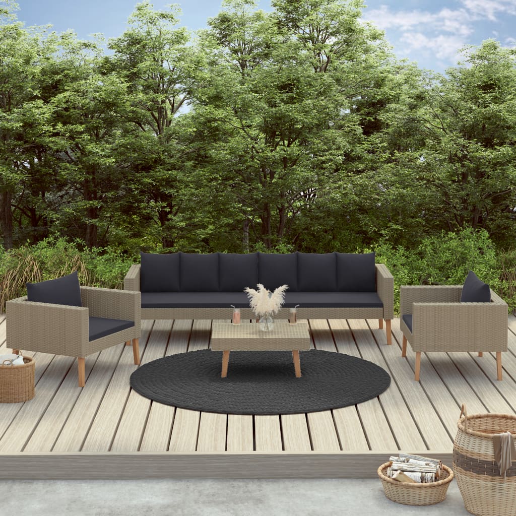 Genießen Sie einen entspannten, sonnigen Nachmittag oder Sommerabend mit Familie und Freunden auf der Terrasse, im Garten oder Hof auf dieser Sofagarnitur! Dieses Garten-Lounge-Set verfügt über einen Rahmen aus pulverbeschichtetem Stahl mit langlebigem PE-Rattan. Dadurch ist es stabil, robust und pflegeleicht. Die dick gepolsterten Auflagen und die extra tiefen Sitzflächen sorgen für höchsten Sitzkomfort. Der Couchtisch bietet den idealen Platz, um Snacks und Getränke griffbereit zu halten. Dank seiner Leichtbauweise und des modularen Designs lässt sich das Möbelset einfach umstellen und umordnen, um zu jeder Einrichtung zu passen. Das Set wird in 4 Teilen geliefert, sodass Sie je nach Bedarf verschiedene Anordnungen und Kombinationen wählen können. Hinweis: Wir empfehlen, das Set bei Regen, Schnee und Frost abzudecken, um seine Lebensdauer zu verlängern.