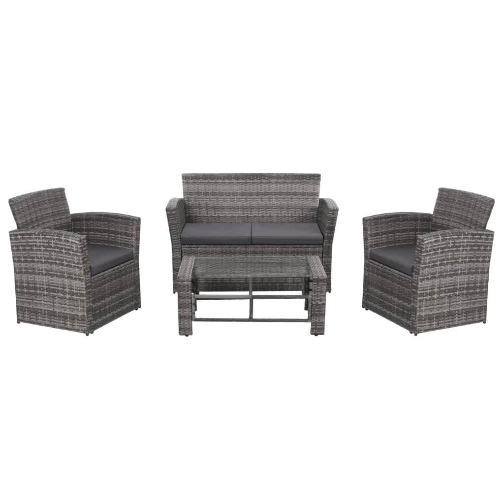 Diese Poly Rattan Sitzgarnitur, bestehend aus 1 2-Sitzer-Sofa, 2 Sesseln, 1 Couchtisch und 4 Sitzkissen, bietet einen stilvollen Sitzbereich für Ihren Garten oder Ihre Terrasse. Dank des wasserfesten PE-Rattans ist das Terrassensofa pflegeleicht, strapazierfähig und für den täglichen Gebrauch im Freien geeignet. Die pulverbeschichteten Stahlrahmen machen das Set stabil und langlebig. Da die Konstruktion jedoch auch leicht ist, lassen sich alle Artikel spielend umher bewegen. Dieses Set wird auch mit den äußerst bequemen, dick gepolsterten Sitzkissen für ultimativen Komfort geliefert. Der pflegeleichte Polyesterüberzug kann auch abgenommen und gewaschen werden. Das Set ist kinderleicht zu montieren. Hinweis: Wir empfehlen, das Set bei Regen, Schnee und Frost abzudecken, um eine lange Lebensdauer zu gewährleisten.