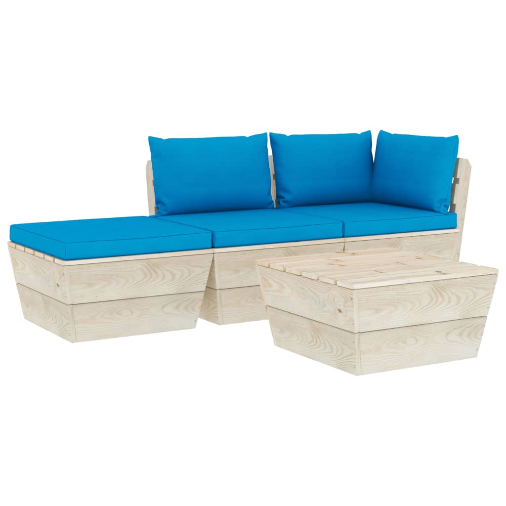 Diese 4-teilige Garten-Sofagarnitur aus Paletten mit Kissen ist eine ausgezeichnete Wahl, um sich zu entspannen und das Wetter zu genießen, ein Nickerchen zu machen oder mit Ihrer Familie oder Freunden zu plaudern. Mit seinem zeitlosen Palettendesign verleiht dieses Lounge-Set aus Holz Ihrer Terrasse, Ihrem Garten oder Ihrem Wohnzimmer einen Hauch von rustikalem Charme. Das Garten-Lounge-Set besteht aus imprägniertem Fichtenholz und ist somit langlebig und stabil. Diese Terrassen-Sofagarnitur verfügt über eine solide Konstruktion und ist wartungsarm. Mit seiner robusten Tischplatte bietet der Tisch den idealen Platz, um Snacks und Getränke griffbereit zu halten. Dank der Bezüge aus 100 % Polyester und der dicken Polsterung fühlen sich die Palettenauflagen weich an und bieten höchsten Komfort. Darüber hinaus ermöglicht Ihnen der modulare Aufbau, das Set in einer beliebigen Anordnung je nach Ihrem Geschmack aufzustellen. Bitte beachten Sie, dass Holz ein Naturprodukt ist und daher Unvollkommenheiten aufweisen kann.