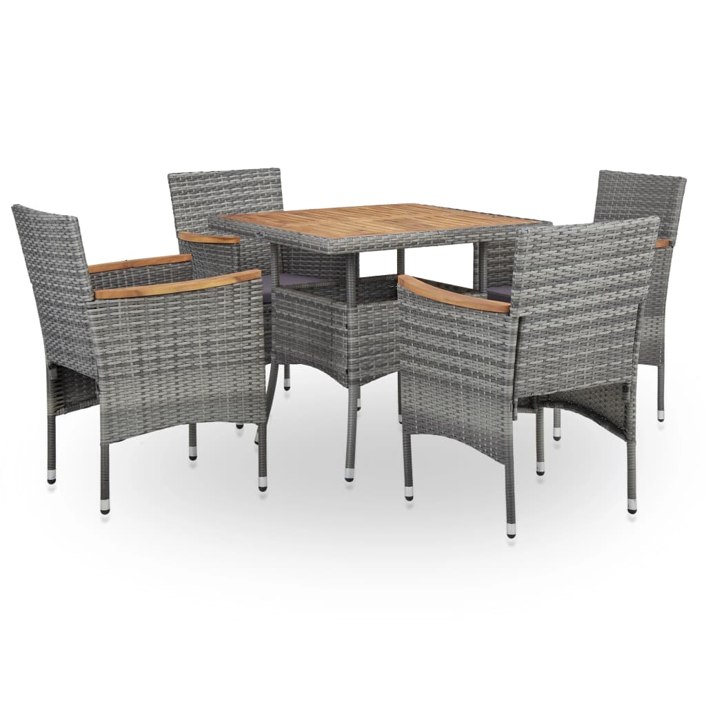 Schaffen Sie eine überzeugende und zusammenhängende Ästhetik und genießen Sie unvergessliche Mahlzeiten in Ihrem Außenbereich mit dieser 5-teiligen Garten-Essgruppe! Komplett mit 1 Esstisch und 4 Sesseln, ist dieses Set perfekt für Ihren Gartenbereich oder Terrasse! Diese Essgruppe hat ein verstärktes Stahlgestell, das mit einem stilvollen, wetterfesten, handgewebten PE-Rattan überzogen ist. Somit kann das Möbelset das ganze Jahr über verwendet werden kann. Die Tischplatte und die Armlehnen sind aus massivem Akazienholz gefertigt, einem tropischen Hartholz, das wetterbeständig und langlebig ist. Die Handwerkskunst und die schöne Holzmaserung machen jedes Möbelstück zu einem Unikat. Die Sitzfläche ist mit einem abnehmbaren, dick gepolsterten Kissen versehen, das zusätzlichen Komfort bietet. Alle Polsterbezüge sind mit Reißverschluss versehen. Durch die leichte Rattan-Konstruktion lässt sich jedes Teil leicht bewegen, umstellen und transportieren. Die Lieferung umfasst 1 Esstisch, 4 Sessel und 4 Sitzkissen. Wichtiger Hinweis: Die Farben können von Stück zu Stück variieren, was jedes dieser Möbelstücke einzigartig macht. Wir empfehlen, das Set bei Regen, Schnee, Frost oder anderen rauen Wetterbedingungen abzudecken, um eine lange Lebensdauer zu gewährleisten.