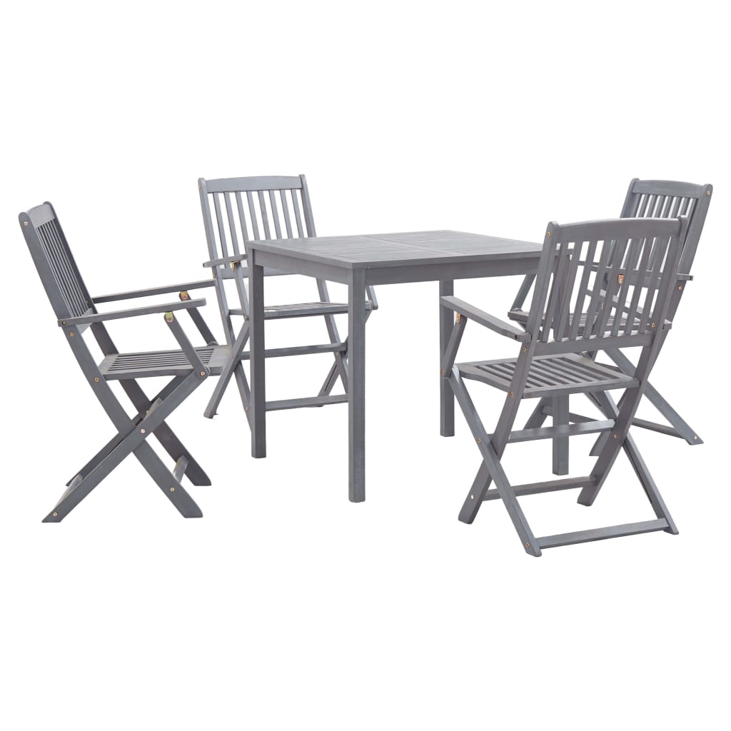 Dieses stilvolle und moderne Gartenmöbel-Set besteht aus einem Esstisch und 4 klappbaren Stühlen und wird jeder Mahlzeit eine luxuriöse Note verleihen. Unser Gartenmöbel-Set aus Holz wird ein echter Hingucker in Ihrem Garten oder auf Ihrer Terasse sein Sowohl der Tisch als auch die Stühle sind aus massivem Akazienholz mit grauer Lackierung gefertigt. Daher sind sie witterungsbeständig, langlebig und lassen sich mit einem feuchten Tuch leicht reinigen. Aufgrund der stabilen Holzstruktur ist dieses Set sehr robust und sicher. Darüber hinaus bietet es Ihnen Komfort und Bequemlichkeit, um wertvolle Zeit mit Familie und Freunden zu verbringen. Des Weiteren lassen sich die Stühle leicht zusammenklappen, was bei Nichtgebrauch eine einfache Lagerung und Transport ermöglicht. Im Lieferumfang sind 1 Esstisch und 4 Klappstühle enthalten.