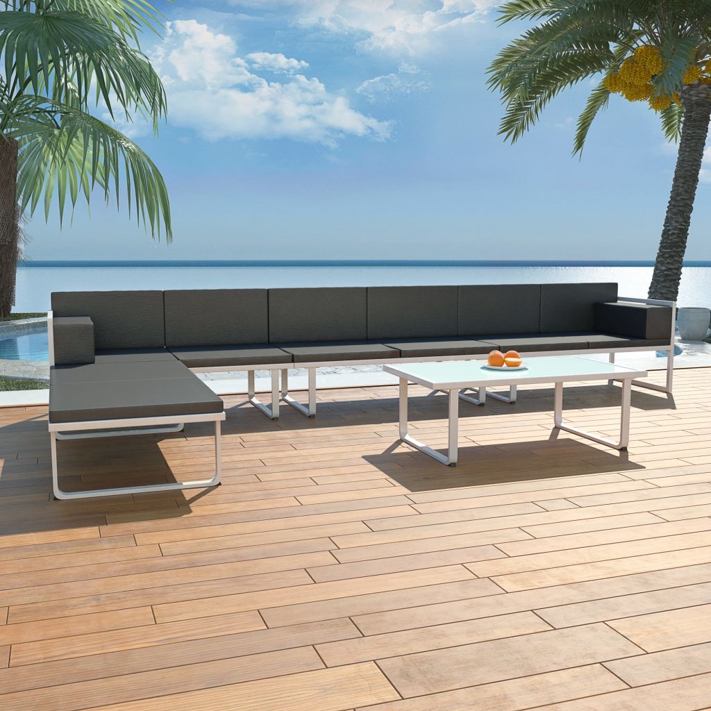 Diese Gartensofa-Garnitur kombiniert Stil, Design und Funktionalität. Sie wird das absolute Highlight in Ihrem Garten oder auf Ihrer Terasse sein. Die komplette Gartengarnitur ist für den ganzjährigen Einsatz im Freien konzipiert. Dank des Rahmens aus 100% Aluminium ist das Sofa-Set einfach zu reinigen, strapazierfähig und für die tägliche Nutzung geeignet. Die Sitzflächen bestehen aus Textilene, einem komfortablen und witterungsunempfindlichen Material. Die dicken, abnehmbaren Sitz-, Rücken- und Armlehnen-Polster sind angenehm weich und waschbar. Die Lieferung enthält zwei 2-Sitzer-Sofateile (links- und rechtsseitig), 1 Sofa-Mittelstück ohne Armlehnen, 1 Ottomane, 1 Couchtisch mit 5 mm starker Glas-Tischplatte, 4 Sitzpolster, 6 Rückenpolster und 2 Armlehnenpolster. Hinweis: Wir empfehlen, das Set bei Regen, Schnee und Frost abzudecken.