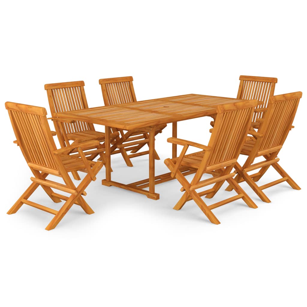 Diese Holz-Garten-Essgruppe eignet sich perfekt zum Essen oder Entspannen im Garten oder auf der Terrasse. Sie ist auch für den Innenbereich ideal geeignet. Das für dieses Möbelstück verwendete Teakholz ist technisch getrocknet und anschließend fein geschliffen worden, um ein sehr glattes Erscheinungsbild zu erzielen. Teakholz ist für seine außergewöhnliche Festigkeit und Witterungsbeständigkeit geschätzt und eignet sich daher weitaus besser für Gartenmöbel als jede andere Holzart. Teakholz ist die perfekte Wahl, wenn Sie ein langlebiges Möbelstück haben möchten. Darüber hinaus widersteht die Essgruppe auch Feuchtigkeit und Insektenbefall. Das Set weist ein schönes Finish auf, das dem Holz eine warme Farbe verleiht. Durch sein spezielles Design kann der Esstisch bei Bedarf um höchstens 200 cm verlängert werden. Es ist außerdem mit einem Schirmloch versehen für einen Schirm zum Schutz vor der Sonne. Außerdem können die Stühle bei Nichtgebrauch leicht zusammengeklappt werden. Sie bieten Ihnen Komfort und Bequemlichkeit, um die Zeit mit Ihrer Familie und Freunden zu genießen. Darüber hinaus ist dieses Set außerdem leicht mit einem feuchten Tuch zu reinigen.