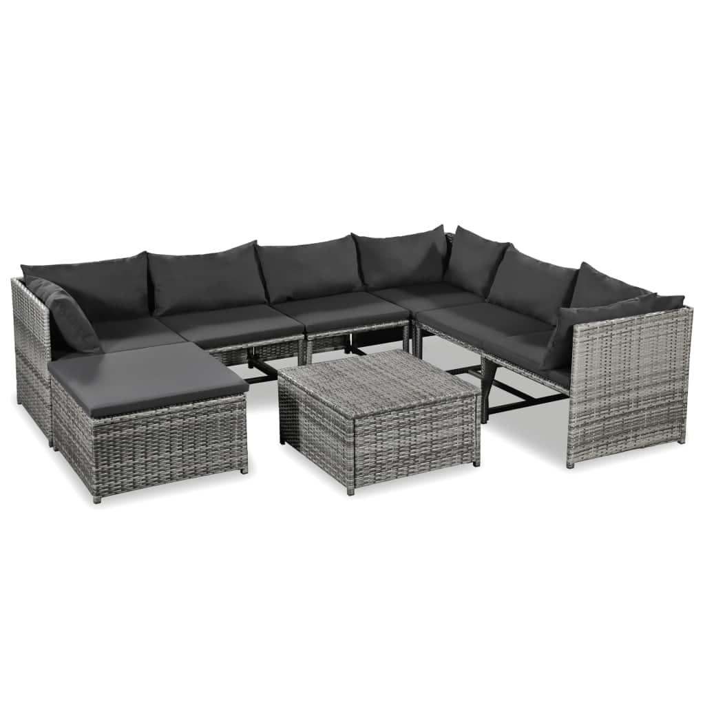 Dieses Poly Rattan Sofa-Set, bestehend aus 3 Sofa-Eckelementen, 3 Sofa-Mittelstücken, 1 Hocker, 1 Couchtisch, 9 Rückenkissen und 7 Sitzpolstern, bietet eine stilvolle Sitzecke für Ihren Garten oder Ihre Terrasse. Dank des wasserabweisenden PE-Rattans ist das Gartensofa-Set leicht zu reinigen, strapazierfähig und für den täglichen Außeneinsatz geeignet. Es ist leichtgewichtig und die modularen Sofaelemente lassen sich leicht umstellen, um Ihre Garteneinrichtung in vielen verschiedenen Varianten aufzuwerten. Dieses Set wird mit hochkomfortablen, dicken Sitzpolstern und Rückenkissen für höchsten Sitzkomfort geliefert. Die pflegeleichten Polyesterbezüge können auch entfernt und gewaschen werden. Das Poly Rattan Set bietet absolute Flexibilität und lässt sich leicht an jede Umgebung anpassen. Dieses Set ist einfach zu montieren. Hinweis: Wir empfehlen, das Set bei Regen, Schnee und Frost abzudecken, um eine lange Lebensdauer zu gewährleisten.