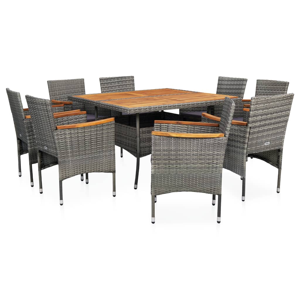 Schaffen Sie eine überzeugende und zusammenhängende Ästhetik und genießen Sie unvergessliche Mahlzeiten in Ihrem Außenbereich mit dieser 9-teiligen Garten-Essgruppe! Komplett mit 1 Esstisch und 8 Sesseln, ist dieses Set perfekt für Ihren Gartenbereich oder Terrasse! Diese Essgruppe hat ein verstärktes Stahlgestell, das mit einem stilvollen, wetterfesten, handgewebten PE-Rattan überzogen ist. Somit kann das Möbelset das ganze Jahr über verwendet werden kann. Die Tischplatte und die Armlehnen sind aus massivem Akazienholz gefertigt, einem tropischen Hartholz, das wetterbeständig und langlebig ist. Die Handwerkskunst und die schöne Holzmaserung machen jedes Möbelstück zu einem Unikat. Die Sitzfläche ist mit einem abnehmbaren, dick gepolsterten Kissen versehen, das zusätzlichen Komfort bietet. Alle Polsterbezüge sind mit Reißverschluss versehen. Durch die leichte Rattan-Konstruktion lässt sich jedes Teil leicht bewegen, umstellen und transportieren. Wichtiger Hinweis: Die Farben können von Stück zu Stück variieren, was jedes dieser Möbelstücke einzigartig macht. Wir empfehlen, das Set bei Regen, Schnee, Frost oder anderen rauen Wetterbedingungen abzudecken, um eine lange Lebensdauer zu gewährleisten.
