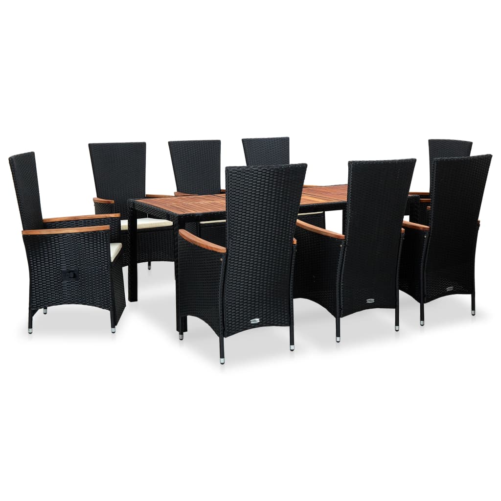 Diese stilvolle Garten-Essgruppe aus Poly Rattan wird zum Mittelpunkt Ihres Gartens oder Ihrer Terrasse! Sie hat ein elegantes, zeitgemäßes Design und ist eine gute Wahl für Mahlzeiten im Freien oder zum Entspannen im Garten. Aus wetter- und wasserabweisendem PE-Rattan gefertigt, ist die Essgruppe leicht zu reinigen, strapazierfähig und für den täglichen Gebrauch geeignet. Die pulverbeschichteten Stahlrahmen machen den Tisch und die Stühle stark und robust. Die Tischplatte und die Armlehnen bestehen aus Akazienholz, einem tropischen Hartholz, das einen rustikalen Charme verleiht. 2 der 8 Stühle sind verstellbar, da sie über verstellbare Rückenlehne und Fußstütze verfügen. Durch Drücken der Taste an der Seite wird die Rückenlehne zurückgelehnt und die Fußstütze bewegt sich gleichzeitig nach oben, um eine bequeme Liegeposition für Sie zu schaffen. Durch die leichte Bauweise sind die Stühle leicht zu manövrieren. Die dicken, weichen, schaumstoffgefüllten Sitzkissen sind sehr komfortabel und aus wasserabweisendem Polyester gefertigt. Die Kissenbezüge mit Reißverschlüssen können leicht entfernt und gewaschen werden. Hinweis: Wir empfehlen, das Set bei Regen, Schnee oder Frost abzudecken.