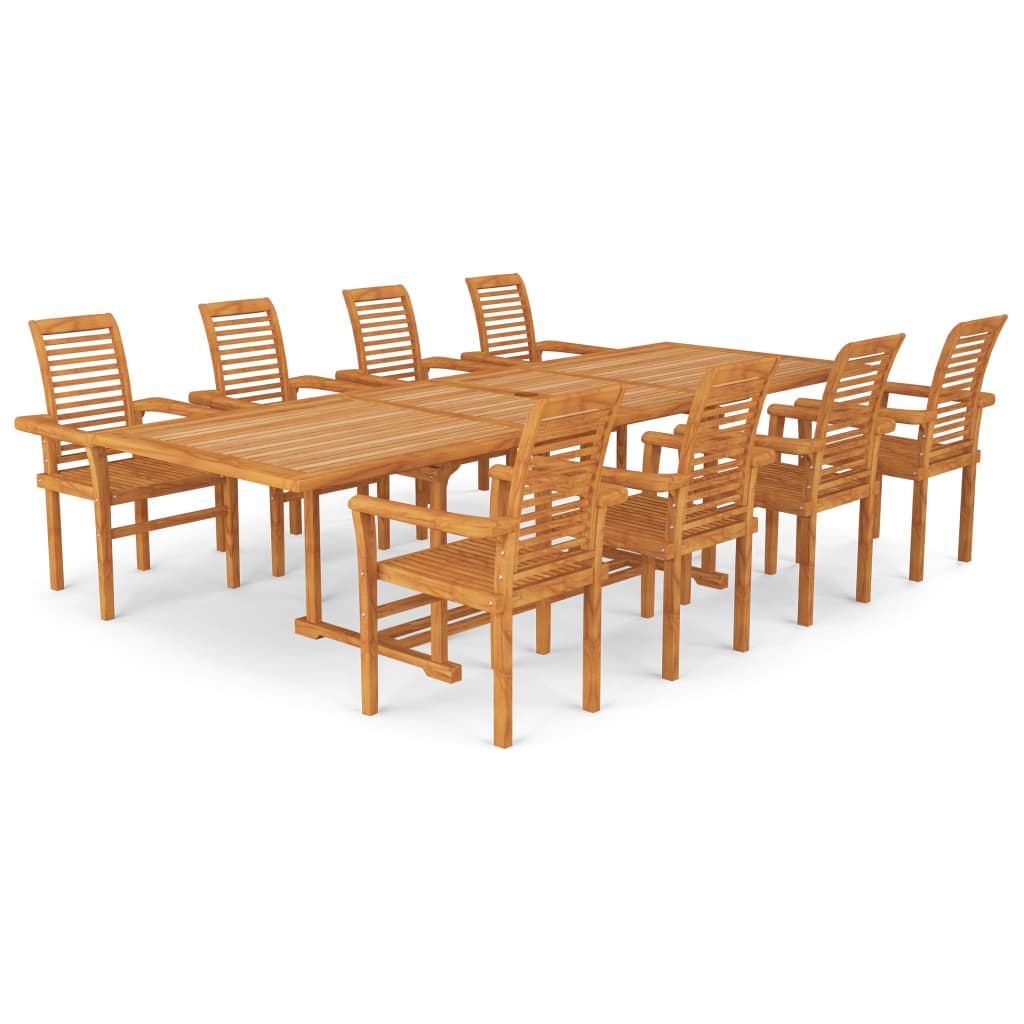 Diese Holz-Garten-Essgruppe eignet sich perfekt zum Essen oder Entspannen im Garten oder auf der Terrasse. Sie ist auch für den Innenbereich ideal geeignet. Das für dieses Möbelstück verwendete Teakholz ist technisch getrocknet und anschließend fein geschliffen worden, um ein sehr glattes Erscheinungsbild zu erzielen. Teakholz ist für seine außergewöhnliche Festigkeit und Witterungsbeständigkeit geschätzt und eignet sich daher weitaus besser für Gartenmöbel als jede andere Holzart. Teakholz ist die perfekte Wahl, wenn Sie ein langlebiges Möbelstück haben möchten. Darüber hinaus widersteht die Essgruppe auch Feuchtigkeit und Insektenbefall. Das Set weist ein schönes Finish auf, das dem Holz eine warme Farbe verleiht. Durch sein spezielles Design kann der Esstisch bei Bedarf um höchstens 280 cm verlängert werden. Es hat auch ein Schirmloch für einen Sonnenschirm zum Schutz vor der Sonne. Dank der ergonomisch gestalteten Rückenlehne und Armlehnen sind diese Gartenstühle bequem und stapelbar, was bei Nichtgebrauch Platz spart. Darüber hinaus ist dieses Set leicht mit einem feuchten Tuch zu reinigen.